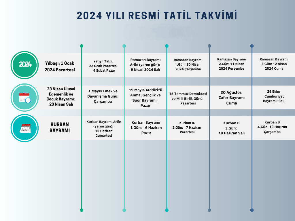 Yılbaşı: 1 Ocak 2024 PazartesiYarıyıl Tatili: 22 Ocak Pazartesi - 4 Şubat PazarRamazan Bayramı Arife (yarım gün): 9 Nisan 2024 SalıRamazan Bayramı 1.Gün: 10 Nisan 2024 ÇarşambaRamazan Bayramı 2.Gün: 11 Nisan 2024 PerşembeRamazan Bayramı 3.Gün: 12 Nisan 2024 Cuma 23 Nisan Ulusal Egemenlik ve Çocuk Bayramı: 23 Nisan Salı1 Mayıs Emek ve Dayanışma Günü: 1 Mayıs Çarşamba19 Mayıs Atatürk'ü Anma, Gençlik ve Spor Bayramı: 19 Mayıs PazarKurban Bayramı Arife (yarım gün): 15 Haziran 2024 CumartesiKurban Bayramı 1.Gün: 16 Haziran 2024 PazarKurban Bayramı 2.Gün: 17 Haziran 2024 PazartesiKurban Bayramı 3.Gün: 18 Haziran 2024 SalıKurban Bayramı 4.Gün: 19 Haziran 2024 Çarşamba15 Temmuz Demokrasi ve Milli Birlik Günü: 15 Temmuz Pazartesi30 Ağustos Zafer Bayramı: 30 Ağustos Cuma29 Ekim Cumhuriyet Bayramı: 29 Ekim Salıkaynak : memurlar.met