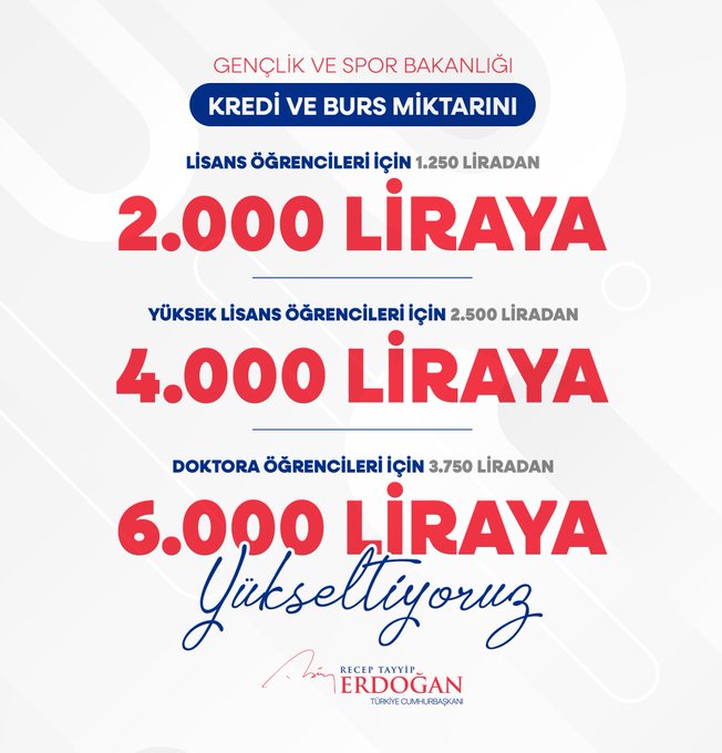 Cumhurbaşkanı Recep Tayyip Erdoğan kabine toplantısının ardından yaptığı açıklamada 2024 yılı kredi ve burs rakamlarını lisans öğrencileri için 2 bin, yüksek lisans için 4 bin, doktora öğrencileri için 6 bin liraya çıkardıklarını açıkladı.