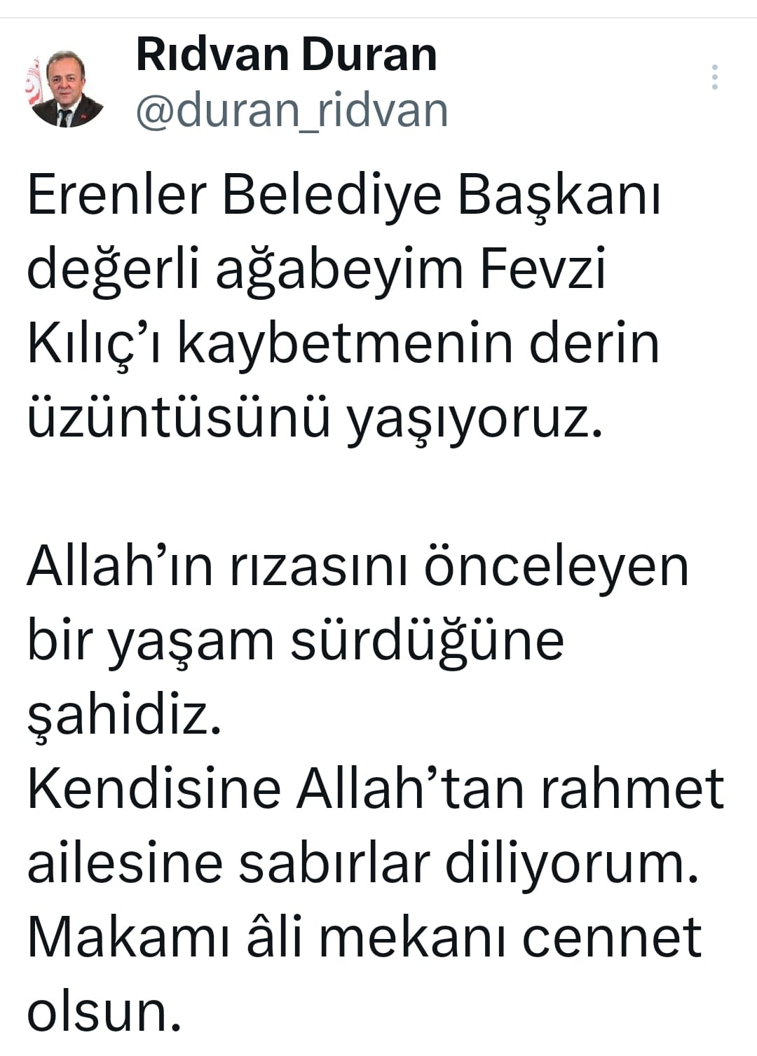 Duran, Twetter mesajında şu ifadelere yer verdi :"Erenler Belediye Başkanı değerli ağabeyim Fevzi Kılıç’ı kaybetmenin derin üzüntüsünü yaşıyoruz. Allah’ın rızasını önceleyen bir yaşam sürdüğüne şahidiz. Kendisine Allah’tan rahmet ailesine sabırlar diliyorum. Makamı âli mekanı cennet olsun."