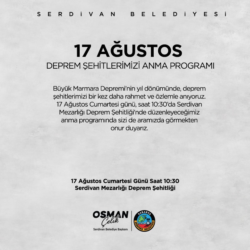 Çelik, mesajında, "17 Ağustos ve geçtiğimiz sene yaşanan 6 Şubat Kahramanmaraş depremleri, bizlere bir kez daha gösterdi ki, afetlere karşı hazırlıklı olmak hayat kurtarır. Bu acı deneyimden ders çıkararak, gelecek nesillere daha güvenli bir yaşam bırakmak hepimizin görevi. Bu vesileyle 17 Ağustos 1999 Depremi’nde hayatını kaybedenlere Allah’tan rahmet, acılı ailelere sabırlar diliyorum. Rabbim bir daha böyle acılar yaşatmasın. Deprem Şehitlerini yâd etmek üzere tüm vatandaşlarımızı 17 Ağustos 2024 Cumartesi günü saat 10.30’da Serdivan Deprem Şehitliği’nde gerçekleştireceğimiz anma programına davet ediyorum.” ifadelerine yer verdi.