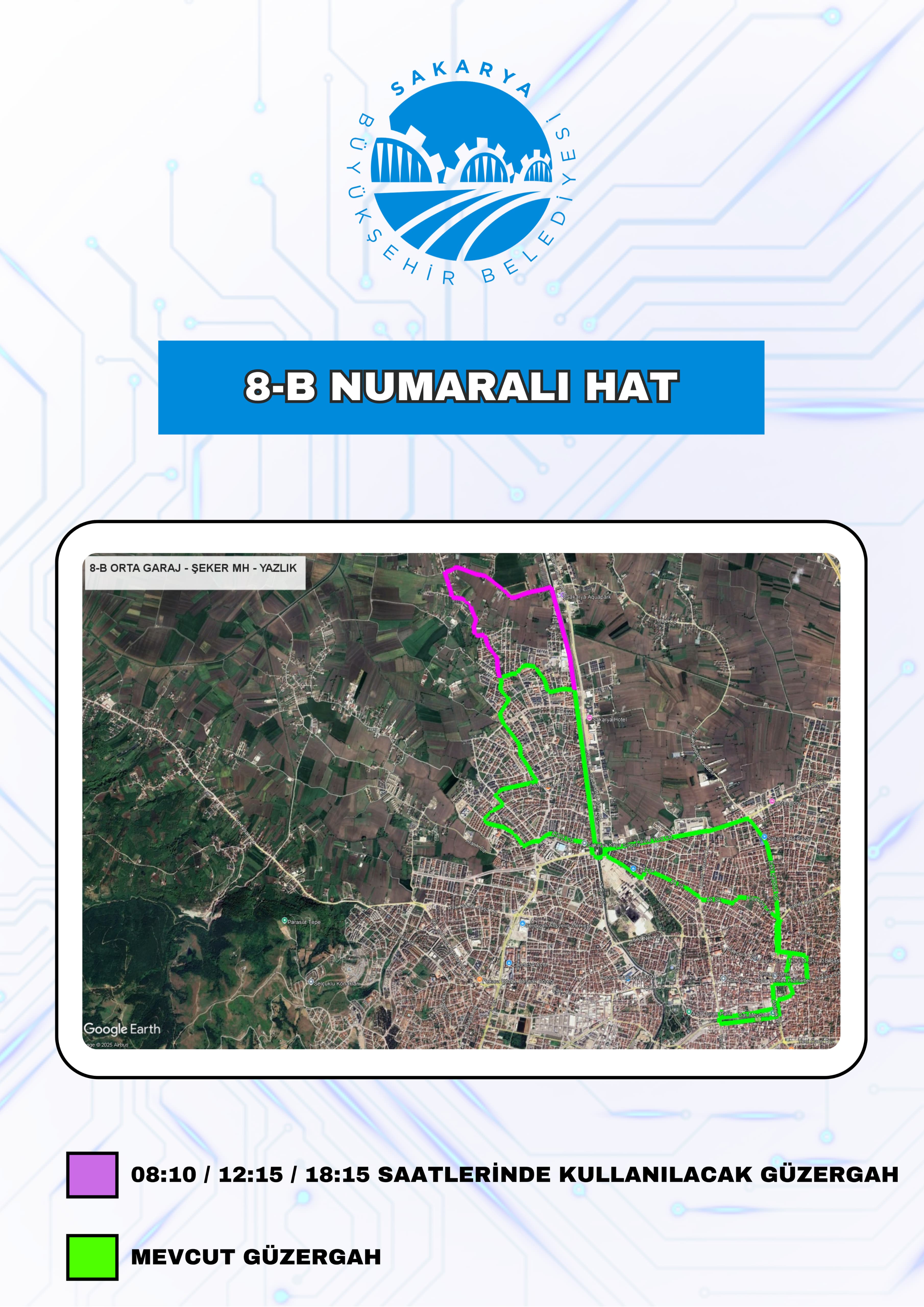 Yine aynı şekilde vatandaşlardan gelen talepler doğrultusunda ‘11’ numaralı Ofis Garaj- Hızırtepe-Et Balık hattı Serdivan’ın Yazlık bölgesine kadar uzatılırken ‘8-B’ numaralı Ofis Garaj-Şeker Mahallesi-Yazlık hattında ise belirli saatlerde güzergah değişikliğine gidildi. Bu kapsamda 8-B hattı saat 08.10, 12.15 ve 18.15 seferlerinde Yazlık Şeker Sokak güzergahından geçecek.
