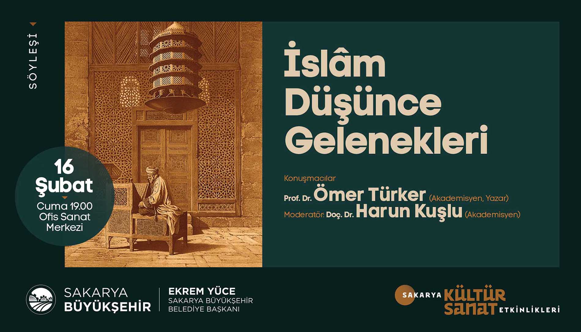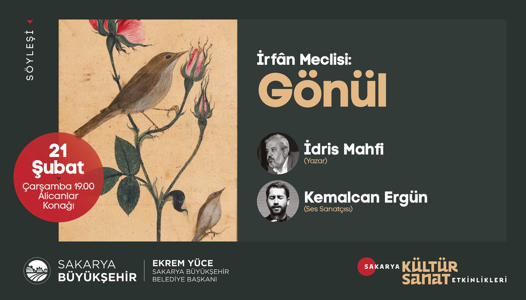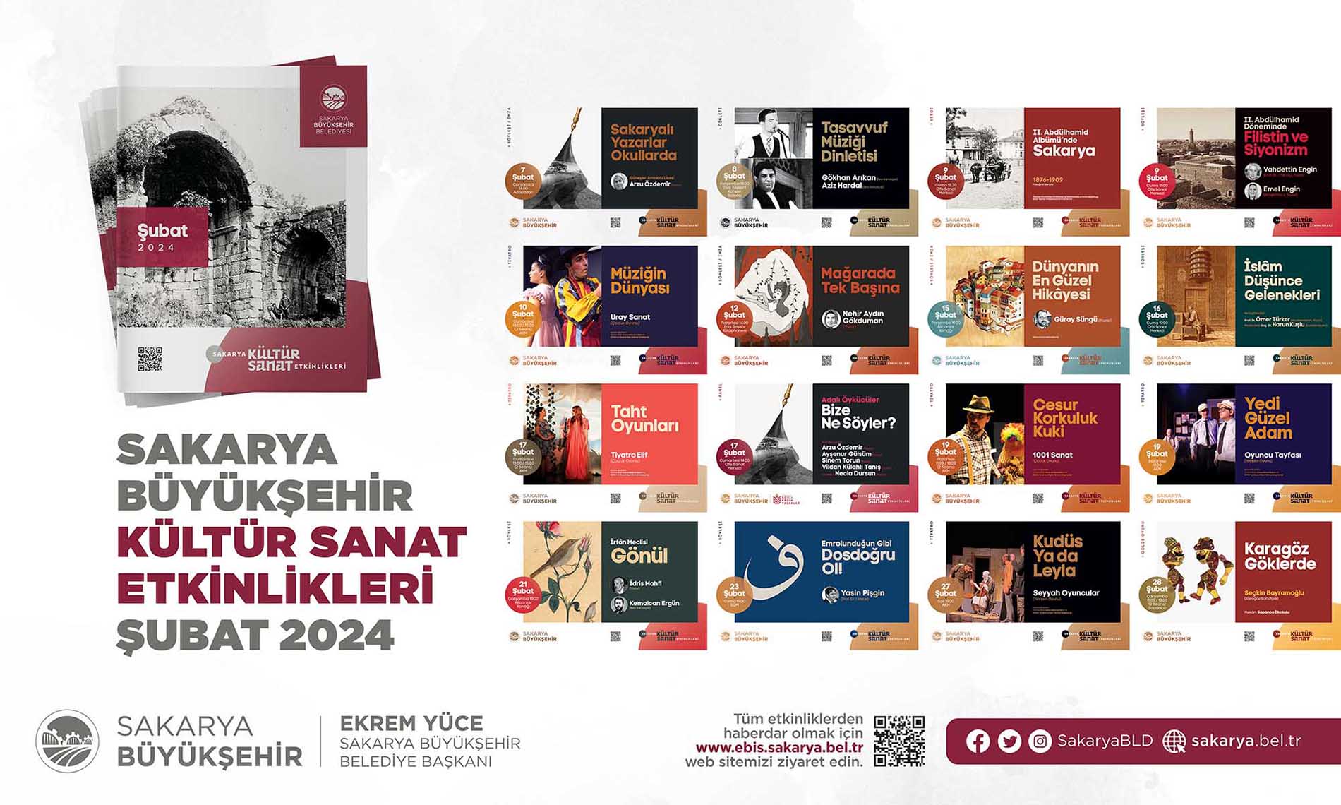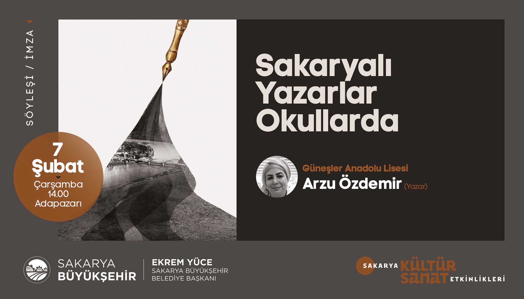 Etkinlikleri için hazırladığı Şubat Ayı Takvimi’ni açıkladı. Türkiye’ye mal olmuş değerli sanatçılar ve akademisyenlerin birbirinden güzel programlarıyla geçecek olan şubat ayı takvimi için söyleşi, panel, tiyatro gösterimi, tasavvuf dinletisi, fotoğraf sergisi ve gölge oyunuyla geçecek olan 16 farklı etkinlik organize edildi. Takvimde sanat duayenleri, çocuklar ve gençler için birbirinden keyifli programlara yer verildi. İŞTE PROGRAM:SöyleşiKonu: Sakaryalı Yazar OkullardaKonuklar: Yazar Arzu Özdemir7 Şubat Çarşamba / AKM / 14.00 DinletiKonu: Tasavvuf Müziği DinletisiKonuklar: Gökhan Arıkan / Aziz Arkan (ses sanatçıları)8 Şubat Perşembe / Ziya Taşkent Konser Salonu / 19.00 SergiKonu: II. Abdülhamid Albümü’nde Sakarya9 Şubat Cuma / Ofis Sanat Merkezi / 18.30 SöyleşiKonu: II. Abdülhamid Döneminde Filistin ve SiyonizmKonuklar: Prof. Vahdettin Engin / Emel Engin (yazarlar)9 Şubat Cuma / Ofis Sanat Merkezi / 19.00 TiyatroKonu: Müziğin DünyasıKonuklar: Uray Sanat (çocuk oyunu)10 Şubat Cumartesi / AKM / 13.00 – 15.00 (iki seans) SöyleşiKonu: Mağarada Tek BaşınaKonuklar: Nehir Aydın Gökduman (yazar)12 Şubat Pazartesi / Faik Baysal Kütüphanesi / 14.00 SöyleşiKonu: Dünyanın En Güzel HikayesiKonuklar: Güray Süngü (Yazar)15 Şubat Perşembe / Alicanlar Konağı / 19.00 SöyleşiKonu: İslam Düşünce GelenekleriKonuklar: Prof. Dr. Ömer Türker / Doç. Dr. Harun Kuşlu16 Şubat Cuma / Ofis Sanat Merkezi / 19.00 TiyatroKonu: Taht OyunlarıKonuklar: Tiyatro Elif (Çocuk oyunu)17 Şubat Cumartesi / AKM / 13.00-15.00 (2 seans) PanelKonu: Adalı Öykücüler Bize Ne Söyler?Konuklar: Yarlar Arzu Özdemir, Ayşenur Gülsüm,Sinem Torun, Vildan Külahlı Tanış, Necla Dursun17 Şubat Cumartesi / Ofis Sanat Merkezi / 14.00 TiyatroKonu: Cesur Korkuluk KukiKonuklar: 1001 Sanat (çocuk oyunu)19 Şubat Pazartesi / AKM / 11.00-13.00 (2 seans) TiyatroKonu: Yedi Güzel AdamKonuklar: Oyuncu Tayfası (yetişkin oyunu)19 Şubat Pazartesi / AKM / 19.00 SöyleşiKonu: İrfan Meclisi – GönülKonuklar: Yazar İdris Mahfi, Ses Sanatçısı Kemalcan Ergün21 Şubat Çarşamba /Alicanlar Konağı / 19.00 SöyleşiKonu: Emrolunduğu Gibi Dosdoğru OlKonuklar: Yazar Prof. Dr. Yasin Pişgin 23 Şubat Cuma / SGM/ 19.00 TiyatroKonu: Kudüs Ya da LeylaKonuklar: Seyyah Oyuncular (yetişkin oyunu)27 Şubat Salı / AKM / 19.00 Gölge OyunuKonu: Karagöz GöklerdeKonuklar: Seçkin Bayramoğlu (Karagöz Sanatçısı)28 Şubat Çarşamba / Sapanca / 11.00-13.00 (2 seans)