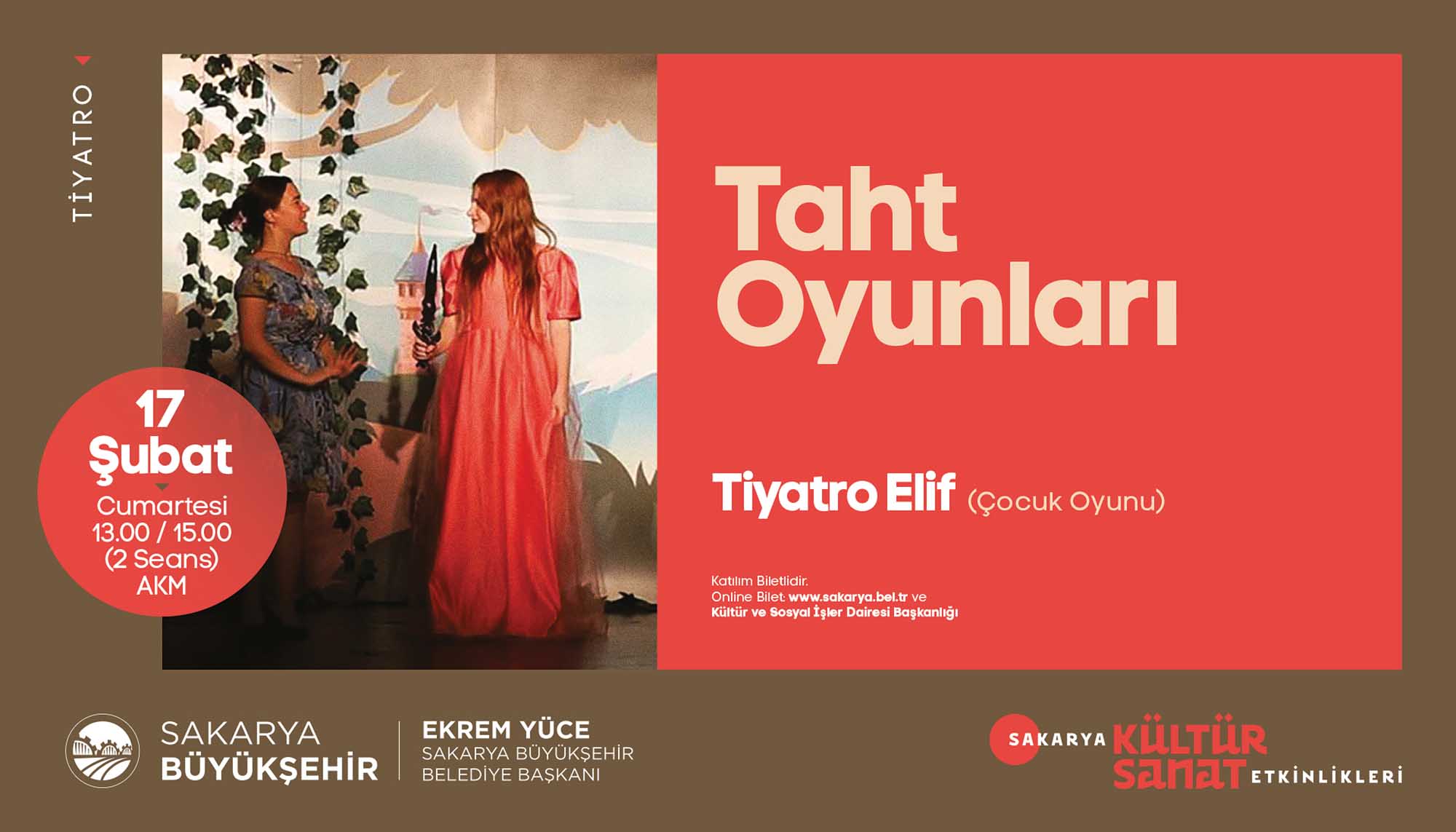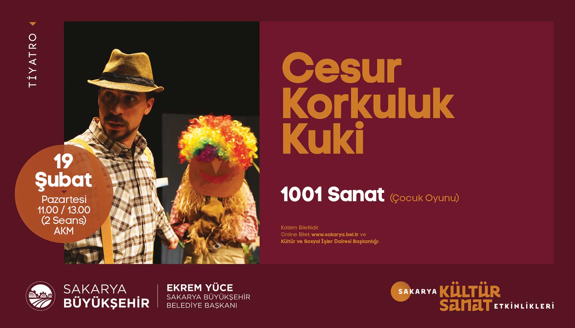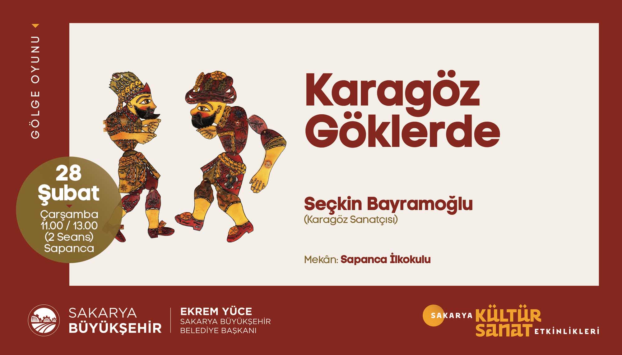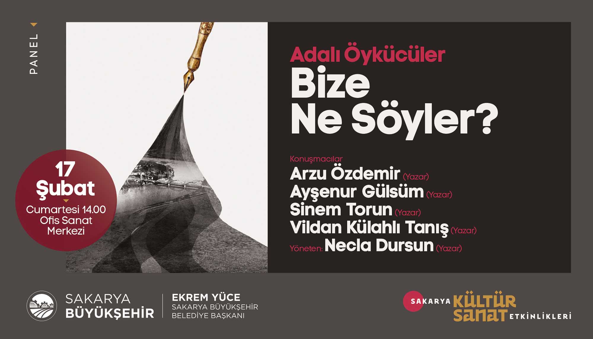 Etkinlikleri için hazırladığı Şubat Ayı Takvimi’ni açıkladı. Türkiye’ye mal olmuş değerli sanatçılar ve akademisyenlerin birbirinden güzel programlarıyla geçecek olan şubat ayı takvimi için söyleşi, panel, tiyatro gösterimi, tasavvuf dinletisi, fotoğraf sergisi ve gölge oyunuyla geçecek olan 16 farklı etkinlik organize edildi. Takvimde sanat duayenleri, çocuklar ve gençler için birbirinden keyifli programlara yer verildi. İŞTE PROGRAM:SöyleşiKonu: Sakaryalı Yazar OkullardaKonuklar: Yazar Arzu Özdemir7 Şubat Çarşamba / AKM / 14.00 DinletiKonu: Tasavvuf Müziği DinletisiKonuklar: Gökhan Arıkan / Aziz Arkan (ses sanatçıları)8 Şubat Perşembe / Ziya Taşkent Konser Salonu / 19.00 SergiKonu: II. Abdülhamid Albümü’nde Sakarya9 Şubat Cuma / Ofis Sanat Merkezi / 18.30 SöyleşiKonu: II. Abdülhamid Döneminde Filistin ve SiyonizmKonuklar: Prof. Vahdettin Engin / Emel Engin (yazarlar)9 Şubat Cuma / Ofis Sanat Merkezi / 19.00 TiyatroKonu: Müziğin DünyasıKonuklar: Uray Sanat (çocuk oyunu)10 Şubat Cumartesi / AKM / 13.00 – 15.00 (iki seans) SöyleşiKonu: Mağarada Tek BaşınaKonuklar: Nehir Aydın Gökduman (yazar)12 Şubat Pazartesi / Faik Baysal Kütüphanesi / 14.00 SöyleşiKonu: Dünyanın En Güzel HikayesiKonuklar: Güray Süngü (Yazar)15 Şubat Perşembe / Alicanlar Konağı / 19.00 SöyleşiKonu: İslam Düşünce GelenekleriKonuklar: Prof. Dr. Ömer Türker / Doç. Dr. Harun Kuşlu16 Şubat Cuma / Ofis Sanat Merkezi / 19.00 TiyatroKonu: Taht OyunlarıKonuklar: Tiyatro Elif (Çocuk oyunu)17 Şubat Cumartesi / AKM / 13.00-15.00 (2 seans) PanelKonu: Adalı Öykücüler Bize Ne Söyler?Konuklar: Yarlar Arzu Özdemir, Ayşenur Gülsüm,Sinem Torun, Vildan Külahlı Tanış, Necla Dursun17 Şubat Cumartesi / Ofis Sanat Merkezi / 14.00 TiyatroKonu: Cesur Korkuluk KukiKonuklar: 1001 Sanat (çocuk oyunu)19 Şubat Pazartesi / AKM / 11.00-13.00 (2 seans) TiyatroKonu: Yedi Güzel AdamKonuklar: Oyuncu Tayfası (yetişkin oyunu)19 Şubat Pazartesi / AKM / 19.00 SöyleşiKonu: İrfan Meclisi – GönülKonuklar: Yazar İdris Mahfi, Ses Sanatçısı Kemalcan Ergün21 Şubat Çarşamba /Alicanlar Konağı / 19.00 SöyleşiKonu: Emrolunduğu Gibi Dosdoğru OlKonuklar: Yazar Prof. Dr. Yasin Pişgin 23 Şubat Cuma / SGM/ 19.00 TiyatroKonu: Kudüs Ya da LeylaKonuklar: Seyyah Oyuncular (yetişkin oyunu)27 Şubat Salı / AKM / 19.00 Gölge OyunuKonu: Karagöz GöklerdeKonuklar: Seçkin Bayramoğlu (Karagöz Sanatçısı)28 Şubat Çarşamba / Sapanca / 11.00-13.00 (2 seans)