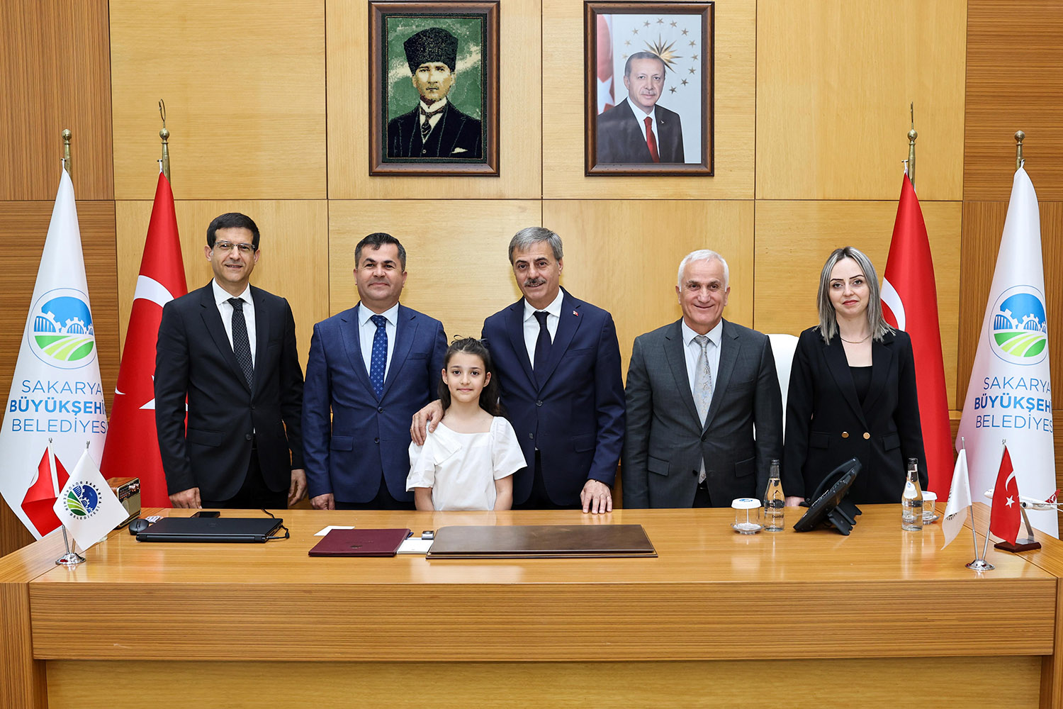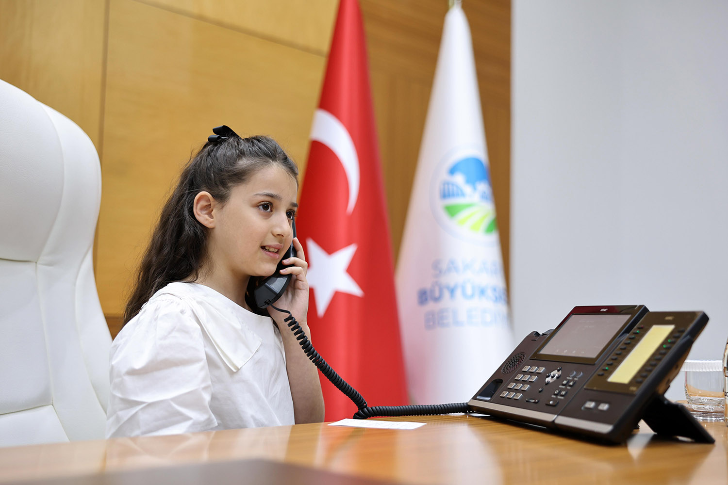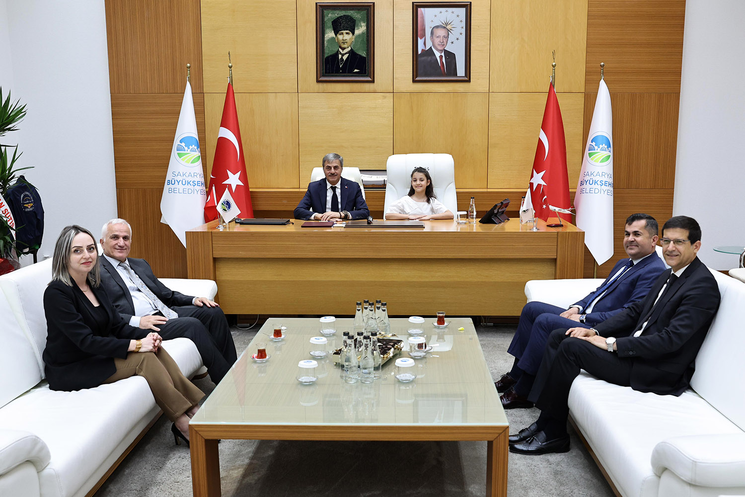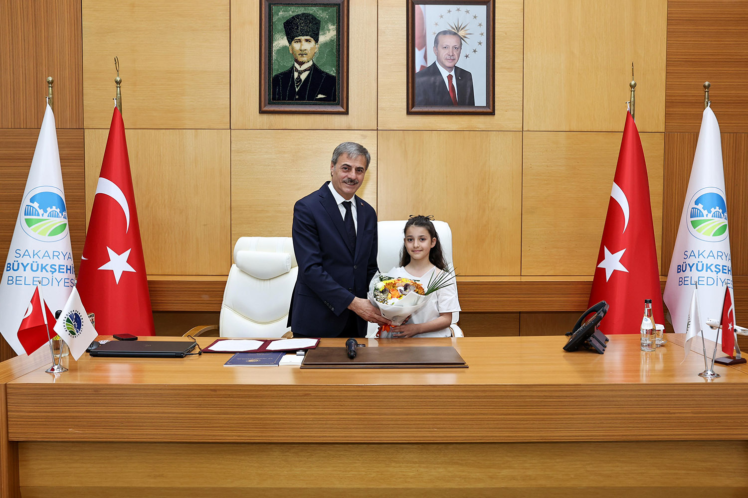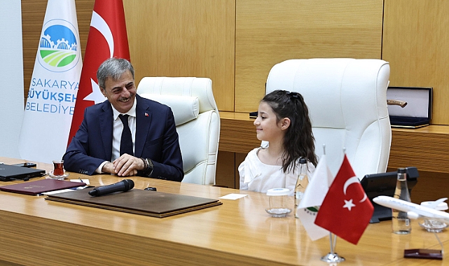 23 Nisan Ulusal Egemenlik Çocuk Bayramı, Sakarya'da her yıl olduğu gibi bu yıl da Büyükşehir'de yapılan devir teslim töreniyle başladı. Başkan Yusuf Alemdar, bu sabah makamında İl Milli Eğitim Müdürlüğü'nden eğitimci ve öğrenci heyeti ağırladı. Mehmet Demir İlkokulu'nda öğrenim gören 4. sınıf öğrencisi Ece Atay, bayram dolayısıyla Büyükşehir Belediyesi'nin başkanlık koltuğuna oturdu.