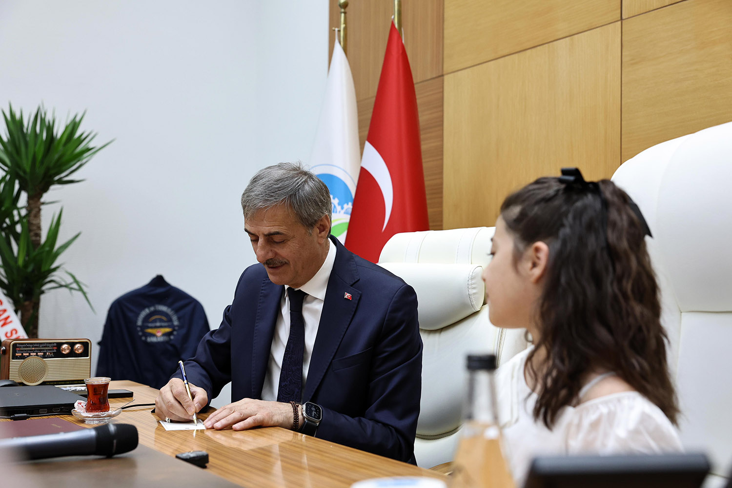 Başkan Alemdar, bayram dolayısıyla makamı devralan ilkokul öğrencisi Ece Atay, Mehmet Demir İlkokulu Müdürü Süfyan Bilgiç ve öğretmenlerine günün anısına hediyeler takdim etti.