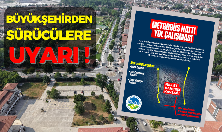 Sakarya Büyükşehir Belediyesi tarafından Şehir Hastanesi ile Gar Meydanı arasında hizmet sunacak metrobüs projesinde çalışmalar tüm hızıyla sürüyor.Çalışmalar kapsamında Millet Bahçesi Kavşağı’nda gerçekleştirilecek yol çalışmaları için Yol Bakım ve Altyapı Koordinasyon Dairesi Başkanlığı’ndan sürücülere Uyarı yapıldı.Akşam saatlerinde trafiğe Kapalı olacakÇalışma kapsamında Farabi Caddesi güzergâhında Şeker Cami ve Millet Bahçesi Kavşağı arası, Kudüs Caddesi güzergâhındaki 2. Geçit ve Millet Bahçesi Kavşağı arası ve Çark Caddesi’nde bulunan Çark Köprüsü ve Millet Bahçesi Kavşağı arası 20.00 – 24.00 arasında trafiğe kapalı olacaktır.
