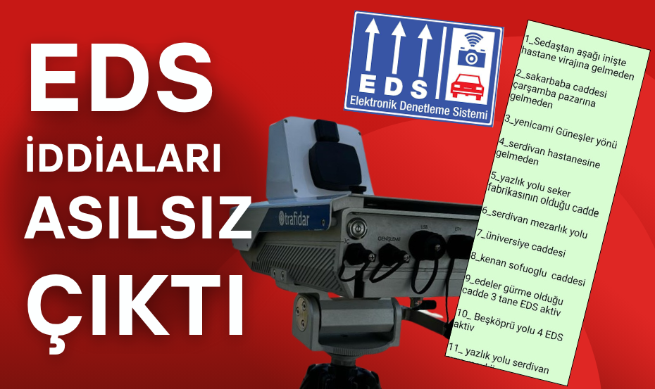 İşte sosyal medyada yayılan asılsız paylaşımın içeriği:“12.06.2025 EDS sabit radar sistemleri aktif edilmiştir.”Sedaş’tan aşağı inişte hastane virajına gelmedenSakaryababa Caddesi, Çarşamba Pazarına gelmedenYeni Cami’den Güneşler yönüneSerdivan Hastanesi’ne gelmedenYazlık yolu, Şeker Fabrikası’nın olduğu caddeSerdivan Mezarlık yoluÜniversite CaddesiKenan Sofuoğlu CaddesiEdeler Gurme’nin olduğu cadde (3 EDS aktif)Beşköprü yolu (4 EDS aktif)Yazlık yolu, Serdivan AVM mevkii