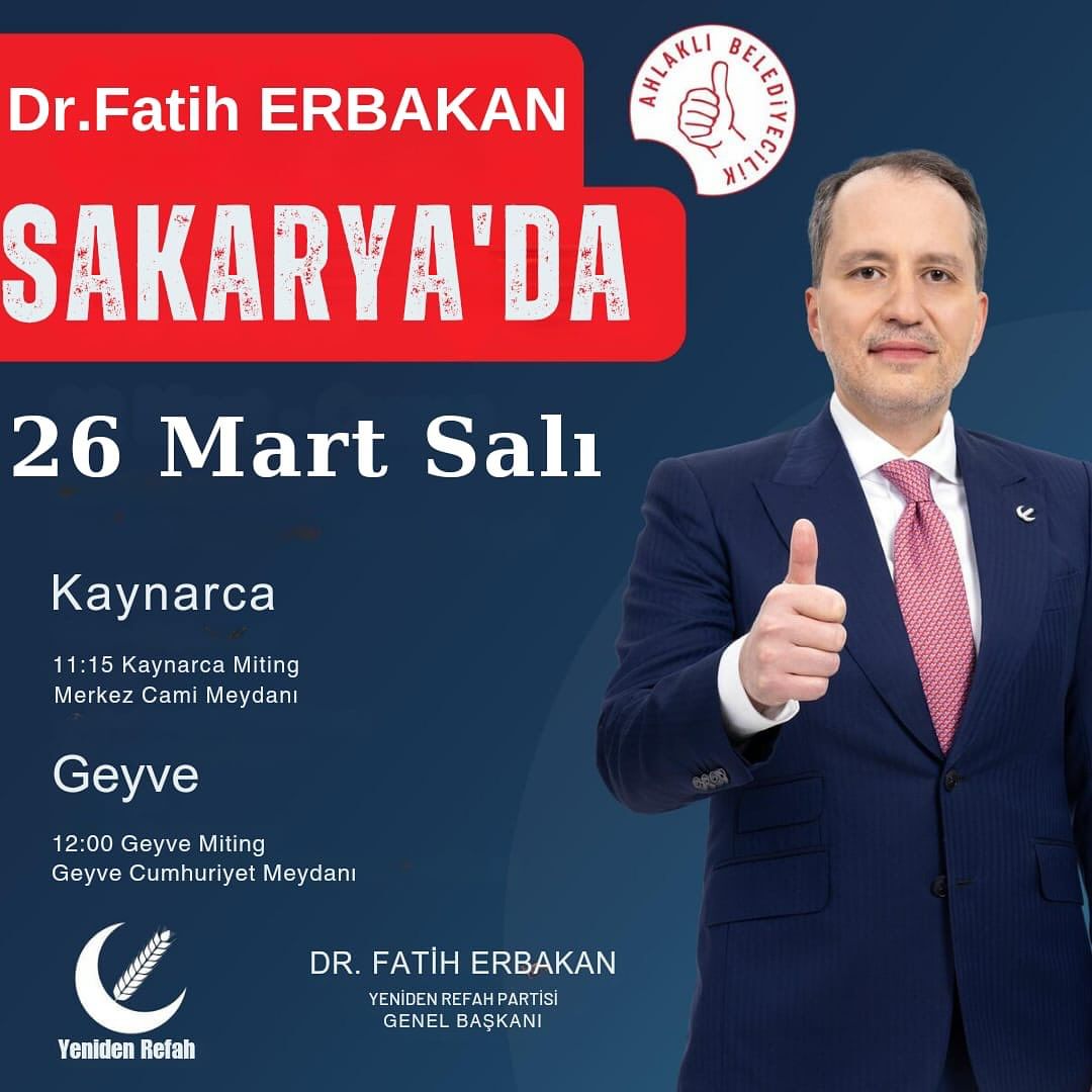 Yeniden Refah Partisi Genel Başkanı Dr. Fatih Erbakan, seçim çalışmaları kapsamında bir dizi ziyarette bulunmak için bugün Sakarya’ya geliyor.Saat 11.15’te Kaynarca ilçesinde merkez Cami Meydanı’nda Miting gerçekleştirecek olan YRP Genel Başkanı Erbakan, saat 12.00’de Geyve Cumhuriyet Meydanı’nda gerçekleştirilecek mitingde vatandaşlarla buluşacak.