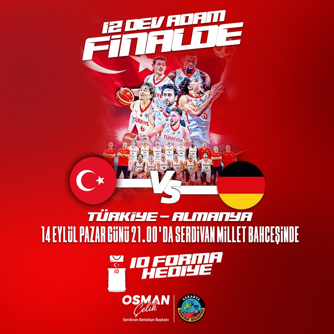 Çeyrek finalde Polonya’yı, yarı finalde ise Yunanistan’ı tarihi farklarla mağlup ederek tüm Türkiye’ye büyük gurur yaşatan 12 Dev Adam, şimdi de Avrupa Şampiyonluğu için parkeye çıkıyor. Serdivanlılar ise her maçta olduğu gibi bu kez de final heyecanında omuz omuza, tek yürek olacak.Final Heyecanı Millet Bahçesi’ndeBelediye yetkilileri, milli coşkunun hep birlikte yaşanabilmesi için Millet Bahçesi’nde dev ekran kurulacağını belirtirken, yarı finalde olduğu gibi final karşılaşmasında da 10 kişiye Milli Takım forması hediye edileceğini duyurdu.Tüm vatandaşlar ve basketbol severler al bayraklarıyla Serdivan Millet Bahçesi’ne davet edildi.Başkan Çelik Millet Bahçesinde OlacakSerdivan Belediye Başkanı Osman Çelik’in de saat 21.00’da Serdivanlılarla birlikte Millet Bahçesi’nde milli heyecana ortak olacağı ifade edildi.
