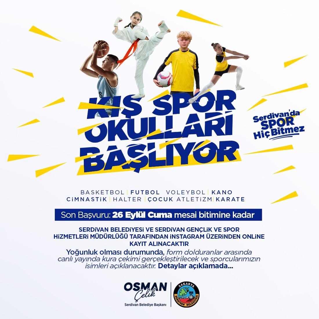 Yaz spor okullarına olan yoğun ilgiyi göz önünde bulunduran Serdivan Belediyesi, kış dönemi için de benzer bir coşku bekliyor ve tüm gençleri sporun birleştirici ruhunu keşfetmeye davet ediyor.Başvurular Online, Son Gün 26 EylülKış Spor Okulları'na katılmak isteyen sporcu adayları için başvurular, @serdivangenclikvespor adlı Instagram hesabı üzerinden online olarak yapılacak. Başvuru formuna bu hesapta yer alan link üzerinden ulaşılabilecek. Kayıtlar için son tarih, 26 Eylül Cuma mesai bitimine kadar olarak belirlendi. Yoğun talep gören branşlarda, başvurular arasından canlı yayında kura çekimi yapılacak ve sporcuların isimleri açıklanacak. Bu şeffaf süreçle, adil bir seçimin hedeflendiği belirtildi.Gençlerin Sporla Gelişimi İçin Kapsamlı Bir AdımSerdivan Belediyesi, bu projeyle gençlerin fiziksel gelişiminin yanı sıra, sporun getirdiği disiplin, takım çalışması ve liderlik gibi değerleri de kazanmalarını amaçlıyor. Spor okulları, gençlerin hem fiziksel hem de sosyal becerilerini geliştirebileceği güvenli ve destekleyici bir ortam sunacak. Belediye Başkanı Osman Çelik'in de önem verdiği ve desteklediği bu tür etkinlikler, Serdivan'ın sporda bir merkez haline gelme vizyonuna önemli katkılar sağlıyor.