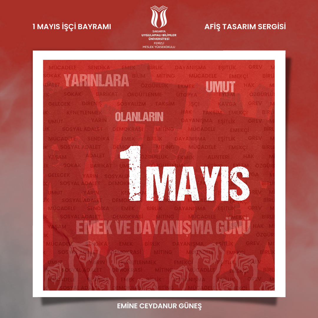 Sakarya Uygulamalı Bilimler Üniversitesi (SUBÜ) Ferizli Meslek Yüksekokulu Grafik Tasarımı Programı öğrencileri, 1 Mayıs Emek ve Dayanışma Günü’ne yönelik afiş tasarımı yaptı. Öğretim Görevlisi Ersin Berk tarafından organize edilen online afiş sergisine 12 öğrenci katıldı.