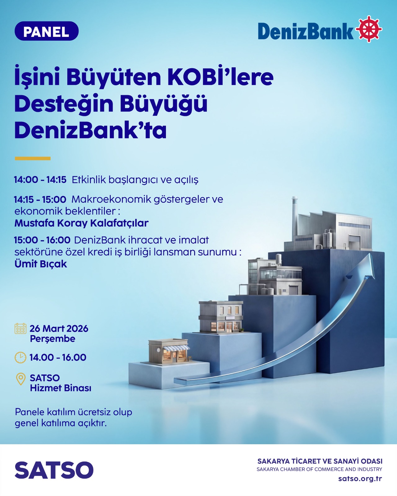Sakarya Ticaret ve Sanayi Odası ile denizbank paydaşlığında, makroekonomik göstergeler ve ekonomik beklentiler, ihracat ve imalat sektörüne özel kredi iş birliği konularının ele alınacağı panel düzenlenecek.26 Mart Perşembe günü sat 14.00 ile 16.00 arasında SATSO hizmet binasında gerçekleştirilecek olan panelde Denizbank yetkilileri Mustafa Koray Kalafatçılar ve Ümit Bıçak tarafından SATSO üyesi KOBİ’lere ayrıntılı bilgiler paylaşılacak.