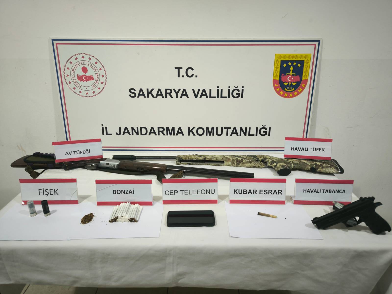 Geyve İlçe Jandarma Komutanlığı sorumluluk bölgesinde ikamet ettikleri belirlenen Ö.P. (29) ve M.K. (27) isimli şüphelilerin adreslerinde yapılan aramalarda; 14 kök skunk bitkisi, 5 kilo 100 gram skunk, 1 adet iklimlendirme sistemi, çeşitli bitki besin maddeleri, 3 adet cep telefonu, 42 adet içime hazır bonzai, 5 gram bonzai, 1 adet kenevir tohumu, 1 adet kubar esrar, 1 ruhsatsız av tüfeği, 1 havalı tüfek, 1 havalı tabanca ve 2 adet 12 kalibre fişek ele geçirildi.