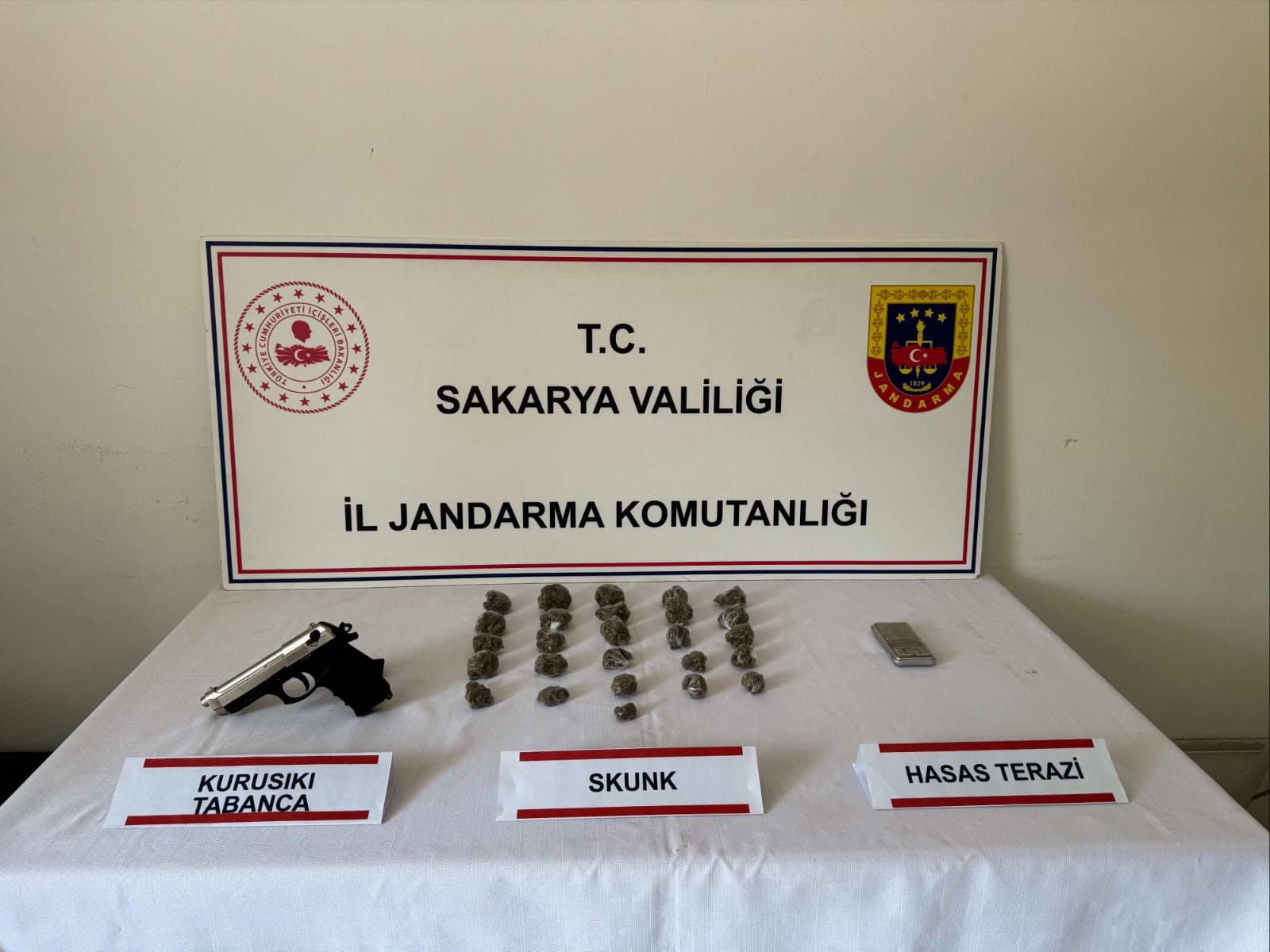 18 Temmuz 2025 tarihinde Söğütlü ilçesinde ikamet eden A.O.A. (30) isimli kişinin evinde yapılan aramada, kavanozlara paketlenmiş 123 gram skunk, 1 adet kuru sıkı tabanca ve 1 adet hassas terazi bulundu.