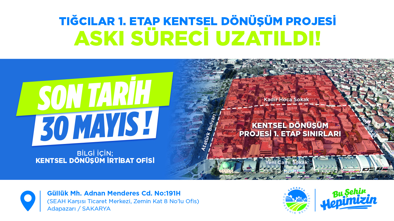 Sakarya Büyükşehir Belediyesi’nin “Dirençli, sosyal ve yeşil bir şehir” vizyonuyla Adapazarı Tığcılar Mahallesi’nde başlattığı Kentsel Dönüşüm çalışmaları kapsamında SEAH karşısında İrtibat Ofisi kurulmuş ve planlar askıya çıkarılmıştı.Büyükşehir, hak sahiplerinin gelip dönüşümü tüm ayrıntılarıyla inceleyebildiği 29 Nisan’da başlayan askı sürecinin 30 Mayıs tarihine kadar uzatıldığını açıkladı.