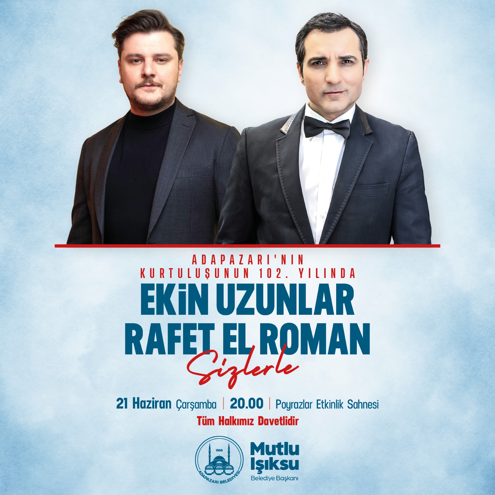 Poyrazlar Etkinlik Sahnesi’nde başlayacak konser programında ilk olarak Adapazarılı sanatçı Sinan Şimşek sahneye çıkacak. Şimşek’in ardından ünlü sanatçılar Ekin Uzunlar ve daha sonra Rafet El Roman gerçekleştirecekleri konserlerle sevenlerine unutulmaz bir akşam yaşatacak.
