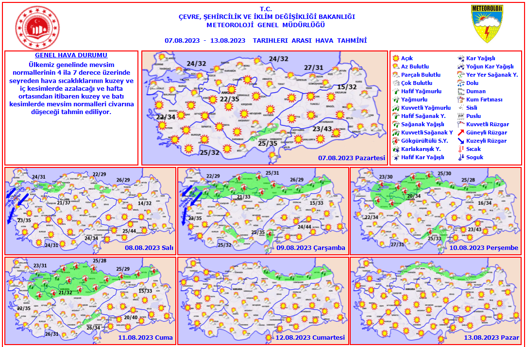 Meteoroloji tarafından yayınlanan haritalarda da salı ve çarşamba gününde Marmara Bölgesi'nin yağmurlu olduğu görüldü. Bunun yanında da hava sıcaklıkları 8-9 derece düşecek. Öte yandan Türkiye el nino sıcaklarının ardından, bu hafta da eyyam-ı bahur sıcaklarının etkisi altına girdi. Eyyam-ı bahur her yıl temmuz sonu ağustos başı yaşanıyor. Bazı illerde termometreler 40 dereceyi gösterdi.
