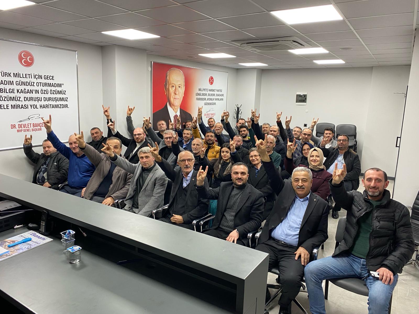 Milliyetçi Hareket Partisi Adapazarı ilçe teşkilatı, ilçe başkanı Recep Usta nezaretinde olağan yönetim kurulu toplantısını yaptı. Toplantıya bu hafta Milliyetçi Hareket Partisi Adapazarı Belediyesi belediye Meclis üyeleri de katıldı. Toplantıda mevcut dönemin değerlendirmesi yapıldı. Komisyon üyeleri komisyon çalışmaları hakkında yönetim kuruluna bilgi verdi. MHP Adapazarı ilçe başkanı Recep Usta : " Beş yıllık bir çalışma süreciyle birlikte dönemin sonuna geldik. Tüm meclis üyelerimize emekleri, gayretleri, fedakarlıkları için çok teşekkür ediyorum. Birlikte çalışmaktan her zaman onur duyacağım değerli meclis üyelerimize bir anı bırakılması adına bu plaketleri takdim ediyoruz. Her ne kadar görev süreleri bitse de ülküdaşlık hukukumuz ebediyyen sürecektir. Bu teşkilat hepimizin yuvası ve evidir. " Dedi. Daha sonra meclis üyelerine plaket takdimine geçildi. Alfabetik sırayla Ali Eroğlu'na ilçe başkanı Recep Usta, Erbay Kayatürk'e ilçe sekreteri Adem Dur, Faik Günhan'a ilçe başkan vekili Selver Burucu, İlknur Bayram Akyüz'e ilçe Kaçep vekili Şerife Açıkgöz, İrem Serdaroğlu'na ilçe yöneticisi Elif Ilıca, Kayhan Alver'e ilçe idari amiri Zeki Kalpak, Kerim Ergezen'e ilçe başkan yardımcısı Fatih Dikici, Mehmet İr'e ilçe muhasibi Alaattin Kuveloğlu, Murat Zımba'ya da ilçe başkan yardımcısı Recep Bulut plaketleri takdim ettiler. Meclis grup başkan vekili Erbay Kayatürk : " Tüm meclis üyeleri adına ilçe yönetimi ve ilçe başkanımıza bizleri onure ettikleri için çok teşekkür ederiz. Hepimiz teşkilatımızın bize vereceği her göreve de hazırız. Bu camianın bir parçası olmaktan da çok mutluyuz. Var olsun teşkilat. " Dedi. Program fotoğraf çekimiyle sona erdi.