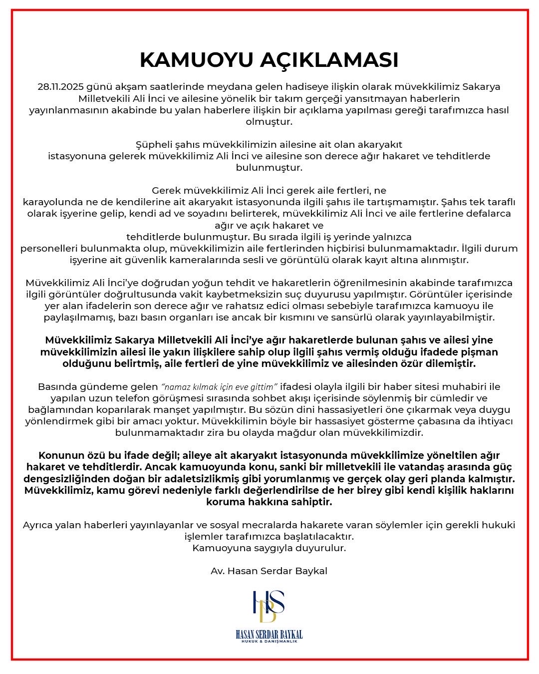 Sakarya Milletvekili Ali İnci ve ailesine yönelik sosyal medyada yer alan bazı iddialar üzerine İnci’nin avukatı Hasan Serdar Baykal tarafından kamuoyuna açıklama yapıldı. Avukat Baykal, 28 Kasım 2025 akşam saatlerinde meydana geldiği belirtilen olayla ilgili basında yer alan haberlerin "gerçeği yansıtmadığını" belirtti.Açıklamaya göre, kimliği açıklanmayan bir şüpheli, İnci’nin ailesine ait olduğu belirtilen bir akaryakıt istasyonuna giderek Milletvekili ve ailesine ağır hakaretlerde bulundu ve tehdit etti. Olay sırasında güvenlik kameralarının kayıtta olduğu, elde edilen görüntülerin de incelemeye alındığı aktarıldı.Avukat Baykal, gerek Ali İnci’nin gerekse aile bireylerinin olayla hiçbir fiziksel temasının olmadığını, tartışmanın yalnızca karşı tarafça çıkarıldığını ifade etti. Açıklamada, olayda suç unsurunun karşılaşılan görüntülerle sabit olduğu, buna rağmen bazı basın organlarında olayın eksik veya sansürlü şekilde yer aldığı savunuldu.Hakaretlerde bulunan şahsın daha sonra hem milletvekilinin ailesiyle yakın ilişkileri olduğunu belirttiği hem de pişmanlık duyduğunu ifade ederek özür dilediği belirtildi.Basına yansıyan “namaz kılmak için eve gittim” cümlesiyle ilgili ise bunun telefon görüşmesi sırasında kullanılan ve olay bağlamından koparılarak manşetlere taşındığı aktarıldı. Avukat Baykal, bu cümlenin "duygusal yönlendirme amaçlı çarpıtıldığını" ifade etti.Konunun özünün, aileye ait akaryakıt istasyonunda milletvekiline yöneltilen ağır hakaret ve tehditler olduğunu belirten Baykal, olayın Milli Eğitim camiasından bir kişi ile ilişkilendirilmesinin ise "gerçek dışı ve maksatlı" olduğunu savundu.Açıklamanın sonunda, milletvekili ve ailesine yönelik hakaret içerikli paylaşımlar yapanlar hakkında hukuki süreçlerin başlatılacağı duyuruldu.Açıklamanın tamamı şöyle :