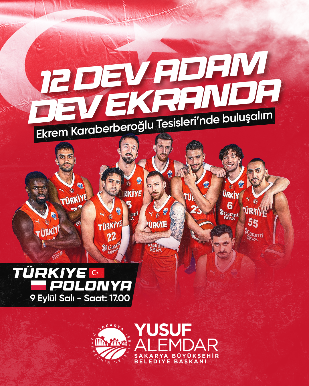 12 dev adam tarih yazıyorSakarya Büyükşehir Belediyesi, Eurobasket’te namağlup ilerleyerek ülkemizi gururlandıran A Milli Basketbol takımımızın Polonya ile oynayacağı çeyrek final mücadelesini dev ekrana taşıyor. Ekrem Karaberberoğlu Altyapı Tesislerinde dev ekrana yansıtılacak karşılaşma Sakarya’da milli heyecan ve gururu bir araya getirecek.