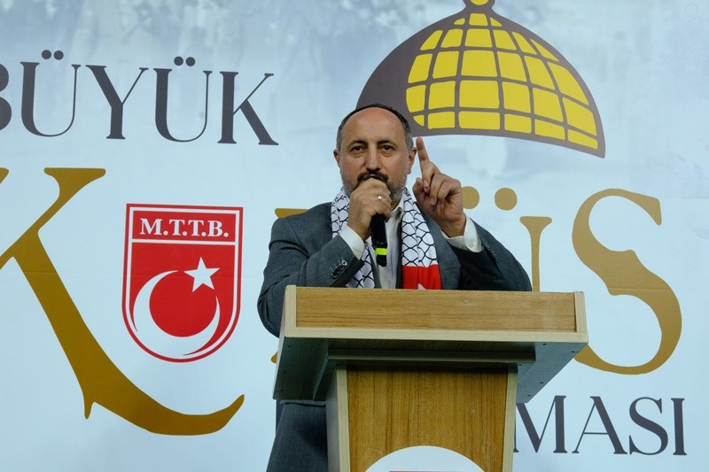 Din, dil, ırk ayrımı gözetmeksizin mazlumun yanında zalimin karşısında dimdik durduk ve durmaya devam edeceğiz. Kudüs hepimizin kırmızı çizgisidir, sembolüdür, imtihanıdır. İsrail yüzünden Filistin topraklarından kan gözyaşı eksik olmamıştır. Bizler Türkiye olarak bu zulmün her zaman karşısındayız. Siyonistlerle mücadelemizden de çekinmeyeceğiz. Ellerinde istedikleri kadar silah, bomba olsun bizim en büyük silah Rabbimin silahıdır. Biz o silahla mücadelemizi sürdüreceğiz inşallah. İslam aleminin üzerine kara bulut getirmek isteyenler bilmelidir ki tarih boyunca yedi cihana adaletle hükmeden bizler buna müsaade etmeyeceğiz. Bakmayın şu anda camilerde dua ettiğimize, meydanlarda tepki gösterdiğimize. Vakti gelecek harekete geçip mükafatını alacağız” şeklinde konuştu.
