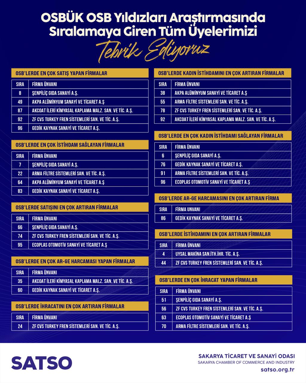 OSBÜK tarafından gerçekleştirilen araştırmanın sonuçları Ankara’da gerçekleşen ödül töreninde açıklandı. Açıklanan sonuçlara göre Sakarya’dan 8 firma 10 kategoride bulunma başarısı gösterdi.Toplam 12 kategoriye ayrılan araştırmanın ödül gecesinde 120 plaket takdim edildi.Sakarya’dan 8 FirmaÇalışmalarıyla listede bulunma başarısı gösteren Sakaryalı firmalar ise AKCOAT İleri Kimyasal Kaplama Malz. San. ve Tic. A.Ş., AKPA Alüminyum Sanayi ve Ticaret A.Ş, ARMA Filtre Sistemleri San. ve Tic. A.Ş., ECOPLAS Otomotiv Sanayi ve Ticaret A.Ş, GEDİK Kaynak Sanayi ve Ticaret A.Ş., ŞENPİLİÇ Gıda Sanayi A.Ş., Uysal Makina San. İth. İhr. Tic. A.Ş. ile ZF CVS Turkey Fren Sistemleri San. ve Tic. A.Ş. oldu.8 Firma 10 Ayrı Listede 30 Kez Yer AldıÖdül gecesinde ZF CVS 6, GEDİK Kaynak 5, ŞENPİLİÇ 5, ARMA Filtre 4, AKCOAT 3, AKPA Alüminyum 3, ECOPLAS 3 ve Uysal Makina 1 kategori listesine girme başarısı göstererek dikkat çekti. Böylece ayrı 10 listede 30 SAKARYA iş dünyası temsilcisi yer almış oldu.