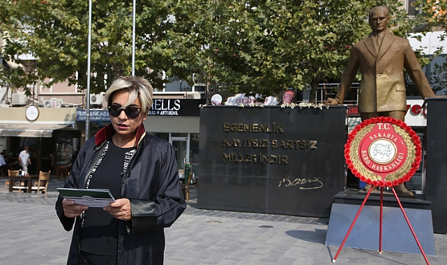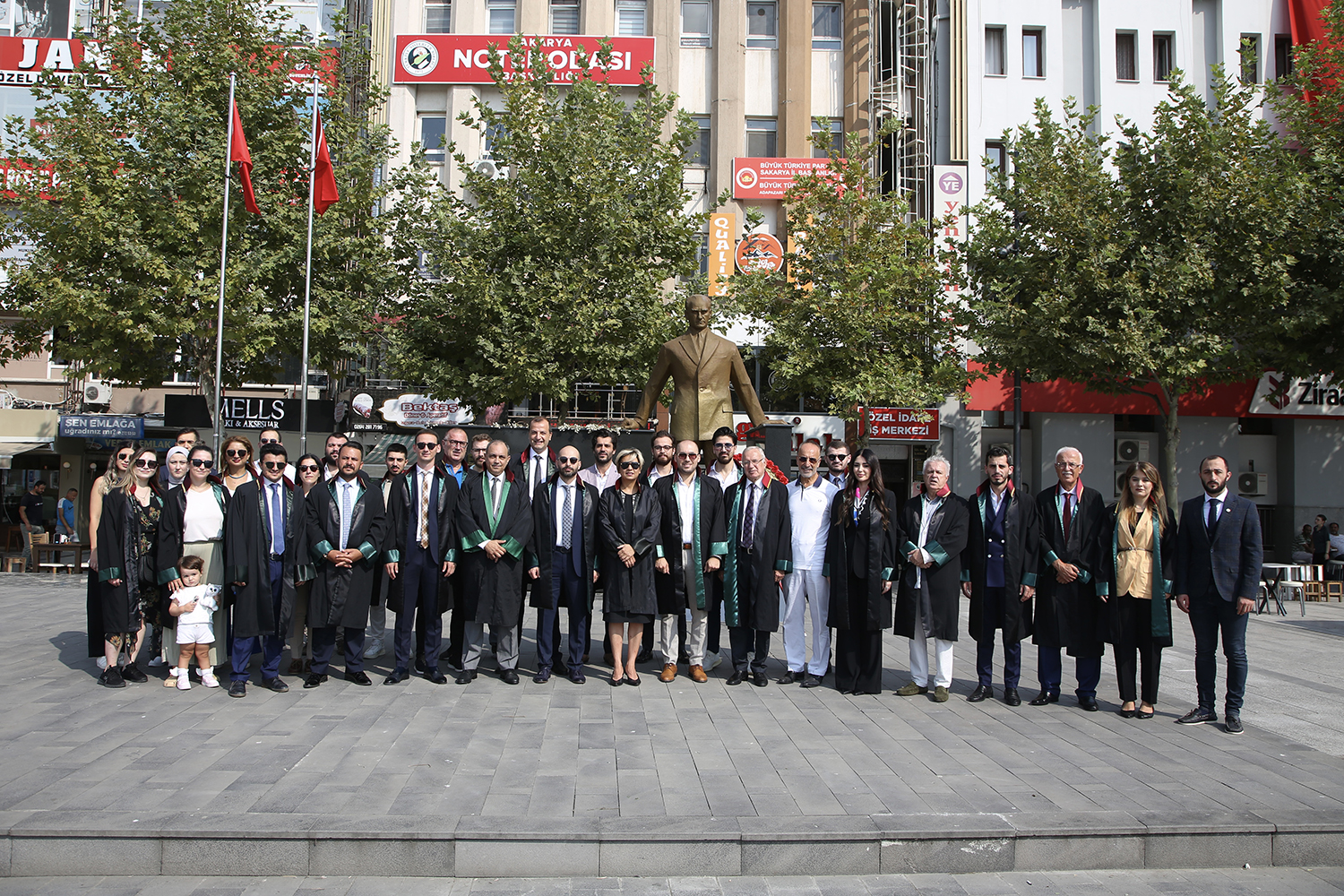 Törende, saygı duruşunda bulunuldu, İstiklal Marşı okundu ve Baro Başkanı Av. İlknur Ebiz Yıldız ile Başkan Yardımcısı Av. Gülşah Baş Duran tarafından Atatürk Anıtı'na çelenk konuldu.