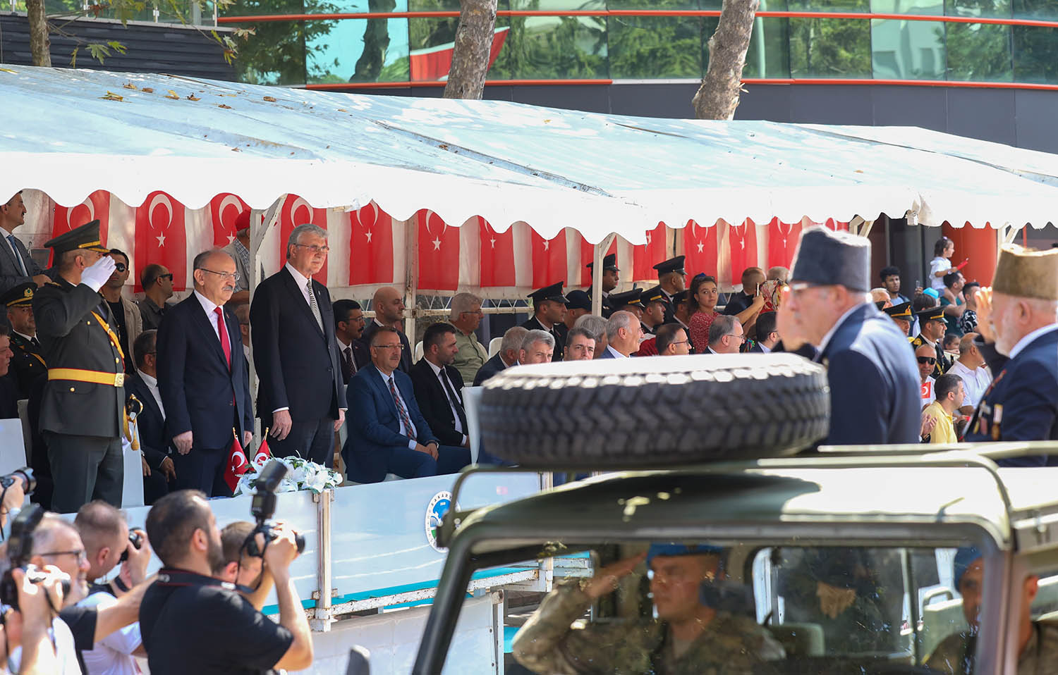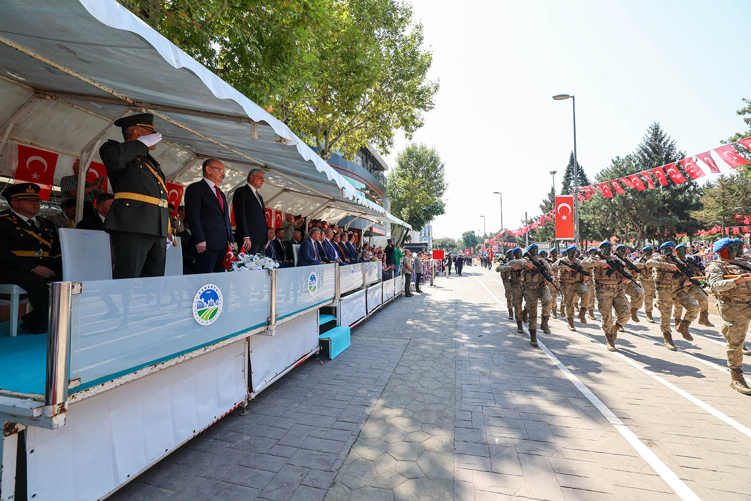 Geçit töreninde Sakarya Valisi Yaşar Karadeniz, Sakarya Büyükşehir Belediye Başkanı Ekrem Yüce ve Topçu Albay Tarık Demirci'nin halkı selamladı.