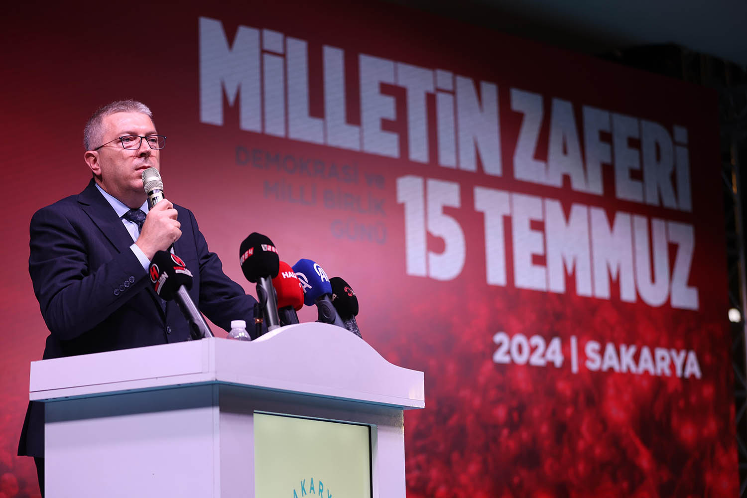Milletin iradesi galip geldiSakaryalıların valilikte, meydanlarda, sokakta silahlara göğsünü siper ettiğini belirterek şöyle dedi: "Bir haber geldi, İzmit'ten tanklar yola çıktı. Kandıra'dan, Taşkısığı'ndan geliyorlardı. Sokağa çıkanlara 'çıkmayın' diye ültimatom vermeye çalışanlara karşı milyonların iradesi galip geldi. Bir kısmı koşarak, yürüyerek valiliğe akın etti. Her taraftan vilayeti esir alıp şehri düşürmeye çalışanlara milletin güçlü duruşu engel oldu. Sakaryalı vatanseverler vilayet binasının etrafını çevirip göğsün siper etti. O gün, bundan sonra hiç kimsenin bu bayrağı indiremeyeceğini, bu ezanı susturamayacağını gösterdi milletimiz.”Milletimizin destanı sonsuza dek hatırlanacakAlemdar, kışlada darbecilerin halkı hedef almasına engel olduklarını belirterek, "Hainler tümende talimat yağdırıyor dediler. Askerimizi milletin üzerine salmaya başlamışlardı. Oraya gittiğimizde vatansever askerimiz, polisimiz ve biz o silahları ellerinden aldık. Başta Cumhurbaşkanımız Recep Tayyip Erdoğan olmak üzere gösterilen irade ve dünyadaki tüm mazlumların duası tecelli etti. Allah hepinizden razı olsun, şehitlerimizi peygamberimize komşu eylesin. Milletin destanı sonsuza dek hatırlanacak" ifadelerini kullandı.