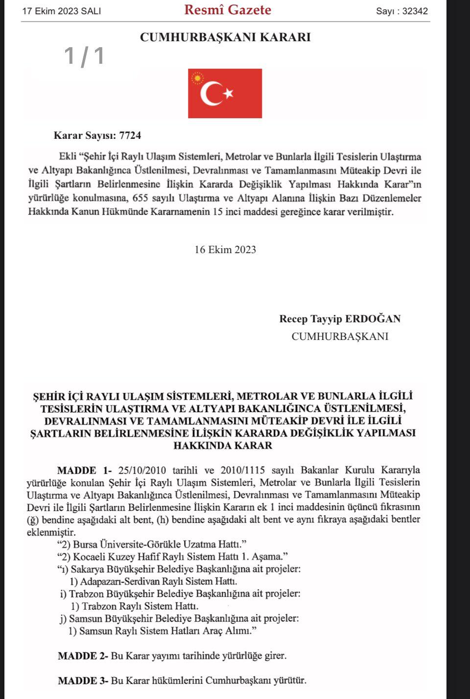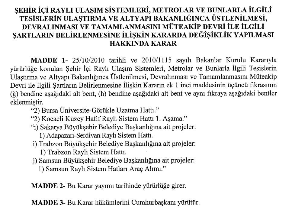 Resmi Gazete’de yayımlanan kararda "Şehir içi raylı ulaşım sistemleri, metrolar ve bunlarla ilgili tesislerin Ulaştırma ve Altyapı Bakanlığınca üstlenilmesi, devralınması ve tamamlanmasını müteakip devri ile ilgili şartların belirlenmesine ilişkin kararda değişiklik yapılması hakkında karar" maddesiyle yer verildi.