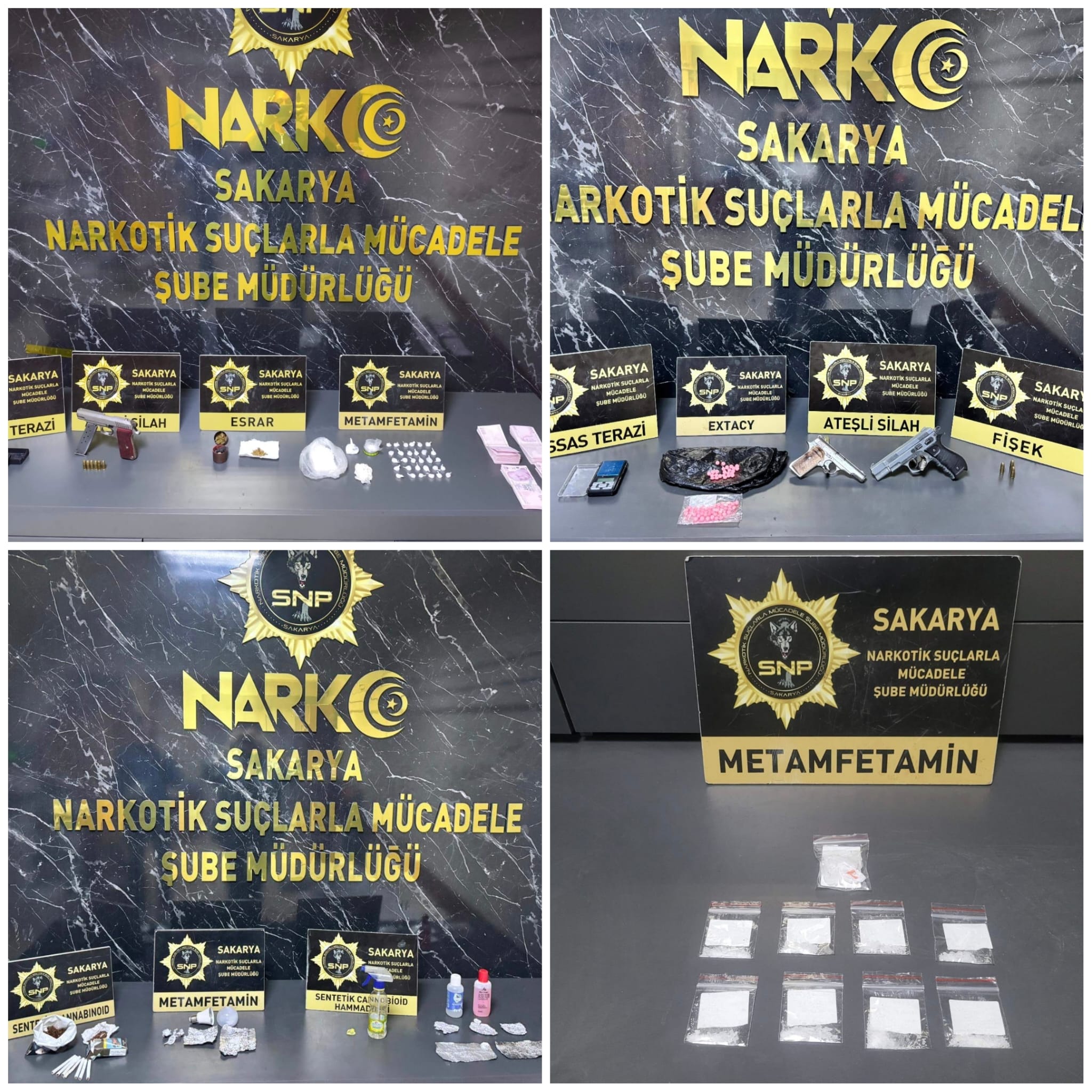 Sakarya Cumhuriyet Başsavcılığı koordinesinde, Sakarya İl Emniyet Müdürlüğü ekiplerince Adapazarı ve Akyazı ilçelerinde düzenlenen üç ayrı uyuşturucu operasyonunda 8 şüpheli yakalandı. Operasyonlarda çok sayıda uyuşturucu madde, silah ve nakit para ele geçirildi.