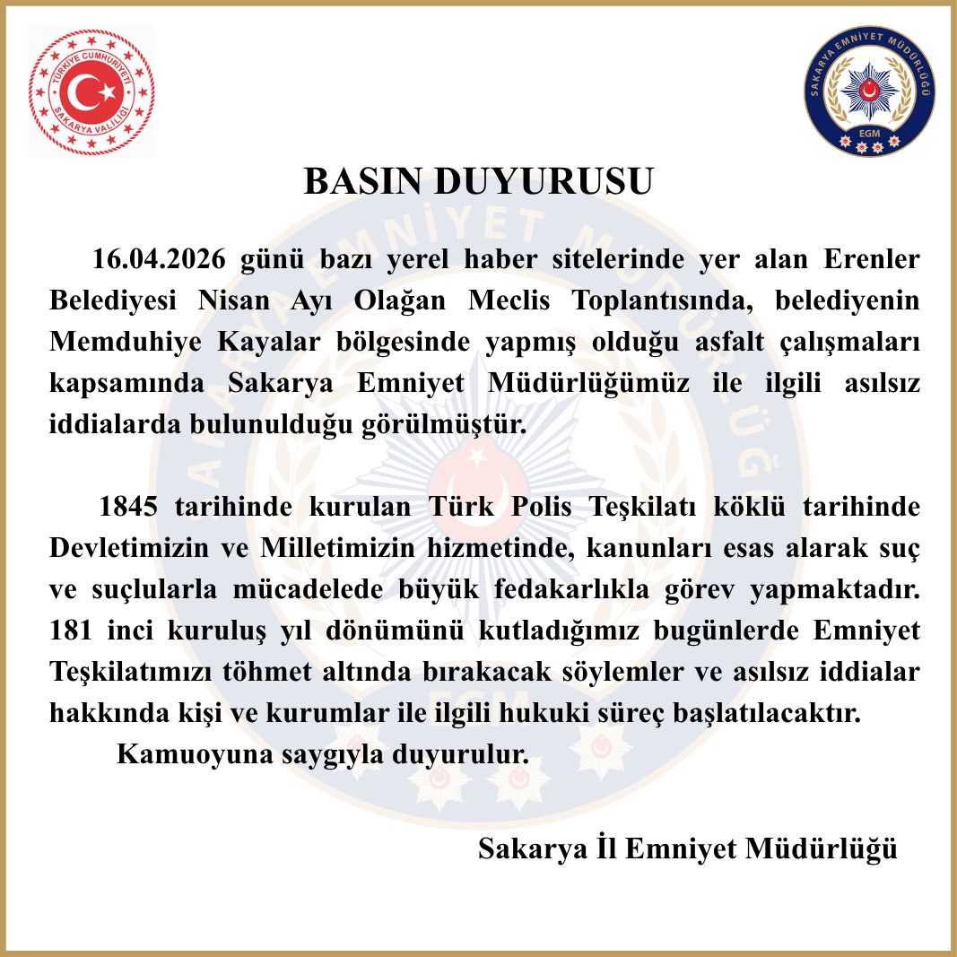 “16.04.2026 günü bazı yerel haber sitelerinde yer alan Erenler Belediyesi Nisan Ayı Olağan Meclis Toplantısında, belediyenin Memduhiye Kayalar bölgesinde yapmış olduğu asfalt çalışmaları kapsamında Sakarya Emniyet Müdürlüğümüz ile ilgili asılsız iddialarda bulunulduğu görülmüştür.
