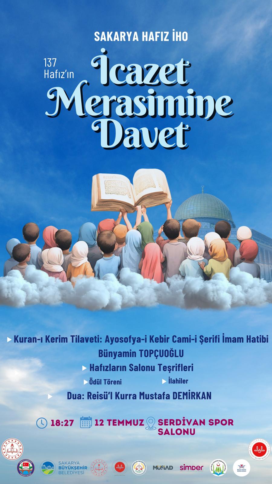 Milli Eğitim Bakanlığının, Diyanet İşleri Başkanlığı ile birlikte yürüttüğü Örgün Eğitimle Birlikte Hafızlık Projesi kapsamında hafızlıklarını tamamlayan öğrenciler için 3. icazet töreni düzenlenecek.Törene ilişkin açıklamalarda bulunun eski mezunlardan Mehmet Emre Uyar :“Mezun olduğum okul ile ilgili böyle bir projenin içerisinde olduğum için çok mutluyum. Yıllar önce bizlerde bu merasimlerde bulunduk. Bu mutluluğu yaşadık. Şu an yaşadığım heyecan çok daha farklı. Ben ve arkadaşlarım kardeşlerimizin merasimini düzenlediğimiz için kendimizi çok şanslı hissediyoruz.Bizlere bu imkanları sağlayan başta okul, kurs idarecilerimiz ve diğer kıymetli hocalarımıza şükranlarımızı sunuyoruz. İnşallah çok güzel bir programı birlikte icra edeceğiz. Serdivan Kapalı Spor Salonu'nda yapılacak icazet törenimiz, 12 Temmuz Cuma günü saat 18.27’de başlayacaktır. Tüm büyüklerimizi davet ediyoruz.” dedi.