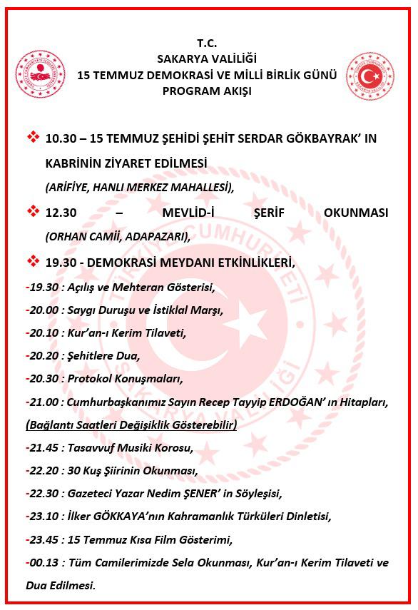 Program, saat 10.30’da 15 Temmuz Şehidi Serdar Gökbayrak’ın Arifiye Hanlı Merkez Mahallesi’ndeki kabri ziyaret edilerek başlayacak. Ardından saat 12.30’da Orhan Camii’nde Mevlid-i Şerif okunacak.Demokrasi Meydanı’ndaki etkinlikler ise saat 19.30’da Mehteran Gösterisi ile başlayacak. Programda saygı duruşu ve İstiklal Marşı’nın ardından Kur’an-ı Kerim tilaveti, şehitler için dua, protokol konuşmaları ve Cumhurbaşkanı Recep Tayyip Erdoğan’ın hitapları yer alacak. (Bağlantı saatlerinde değişiklik olabileceği belirtildi.)Etkinlikler kapsamında ayrıca Tasavvuf Musikisi Korosu konseri, “30 Kuş” şiirinin okunması, gazeteci-yazar Nedim Şener ile söyleşi, sanatçı İlker Gök Kaya’dan kahramanlık türküleri dinletisi, 15 Temmuz konulu kısa film gösterimi gerçekleştirilecek.Program, gece saatlerinde tüm camilerde sela okunması ve Kur’an-ı Kerim tilaveti ile sona erecek.