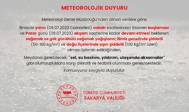 Sakarya Valiliğin sosyal medya hesabından yapılan paylaşımda hafta sonu ( 8-9 Temmuz Cumartesi - Pazar ) olumsuz hava koşullarında yaşanabilecek durumlara karşı vatandaşlardan dikkatli ve tedbirli olunması istendi.