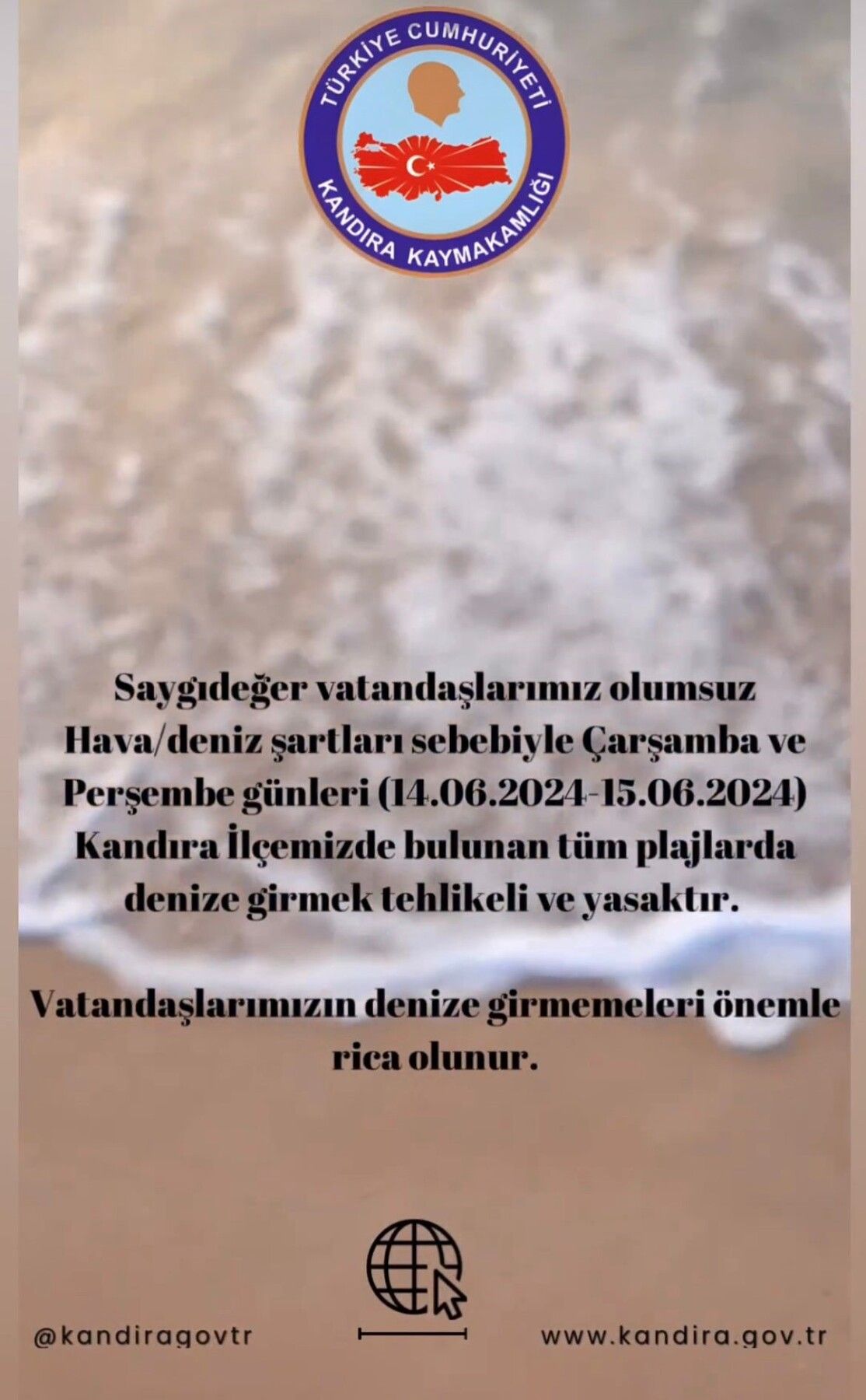 Hava ve deniz şartlarının tehlikeli hale gelmesi üzerine Karadeniz'e kıyısı olan Kandıra, Kocaali,Karasu ve Kaynarca ilçelerinde denize girişler yasaklandı. Kaymakamlıklar tarafından sosyal medya üzerinden yapılan açıklamalardada, bugün ve yarın için alınan tedbirler kapsamında vatandaşların denize girmesinin tehlikeli ve yasak olduğu belirtildi.