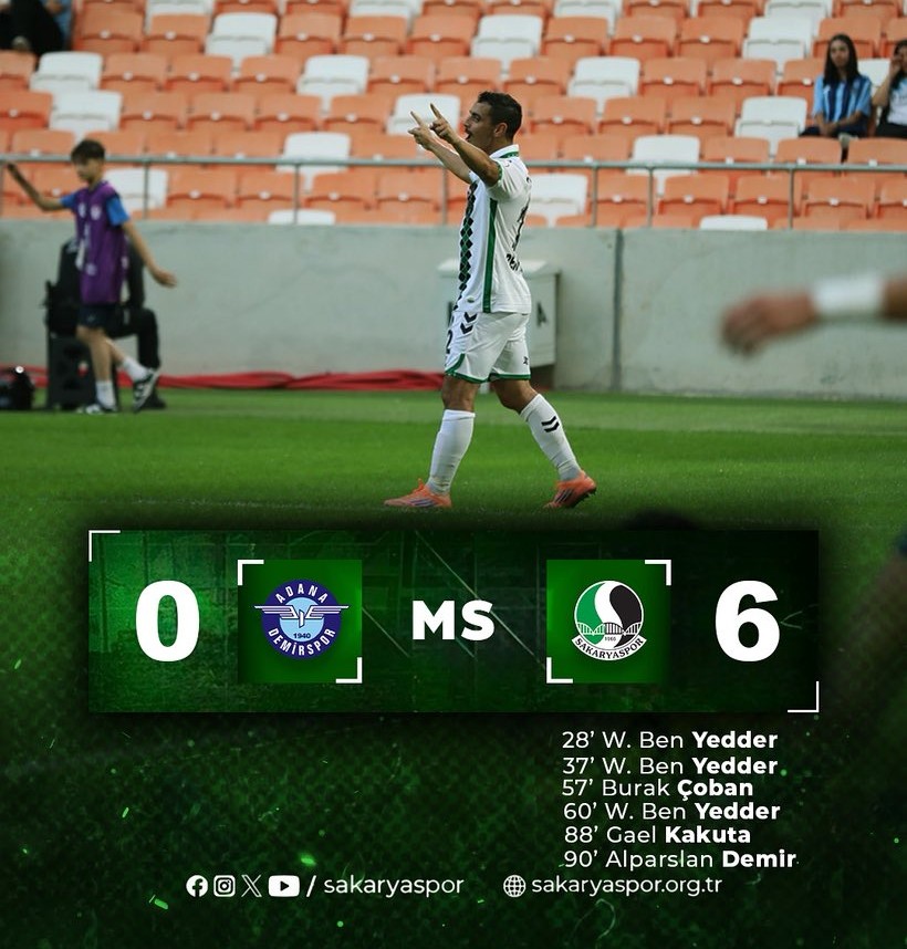 Sakaryaspor, Trendyol 1.Lig’in 10.haftasında deplasmanda Adana Demirspor’a konuk oldu. Adana Stadı’nda oynanan karşılaşmada Yeşil Siyahlılar ligde sıkıntılı günler geçiren rakibi karşısında zorlanmadan 3 puanı farklı skorla aldı. Temsilcimize 6-0’lık galibiyeti getiren golleri Ben Yedder (3), Burak Çoban, Kakuta ve Alpaslan kaydetti. Temsilcimiz bu galibiyet ile puanını 14’e yükseltti.SAKARYASPOR: 6ADANA DEMİRSPOR: 0