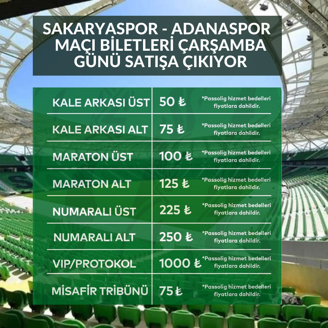 Trendyol1.Lig 2023-2024 sezonunun dokuzuncu haftasında Cumartesi günü saat 16.00'da Sakarya Atatürk Stadyumu'nda oynanacak Sakaryaspor - Adanaspor maçının biletleri Çarşamba (yarın) saat 12.00’de http://passo.com.tr ve Passolig mobil uygulaması üzerinden satışa çıkacak.