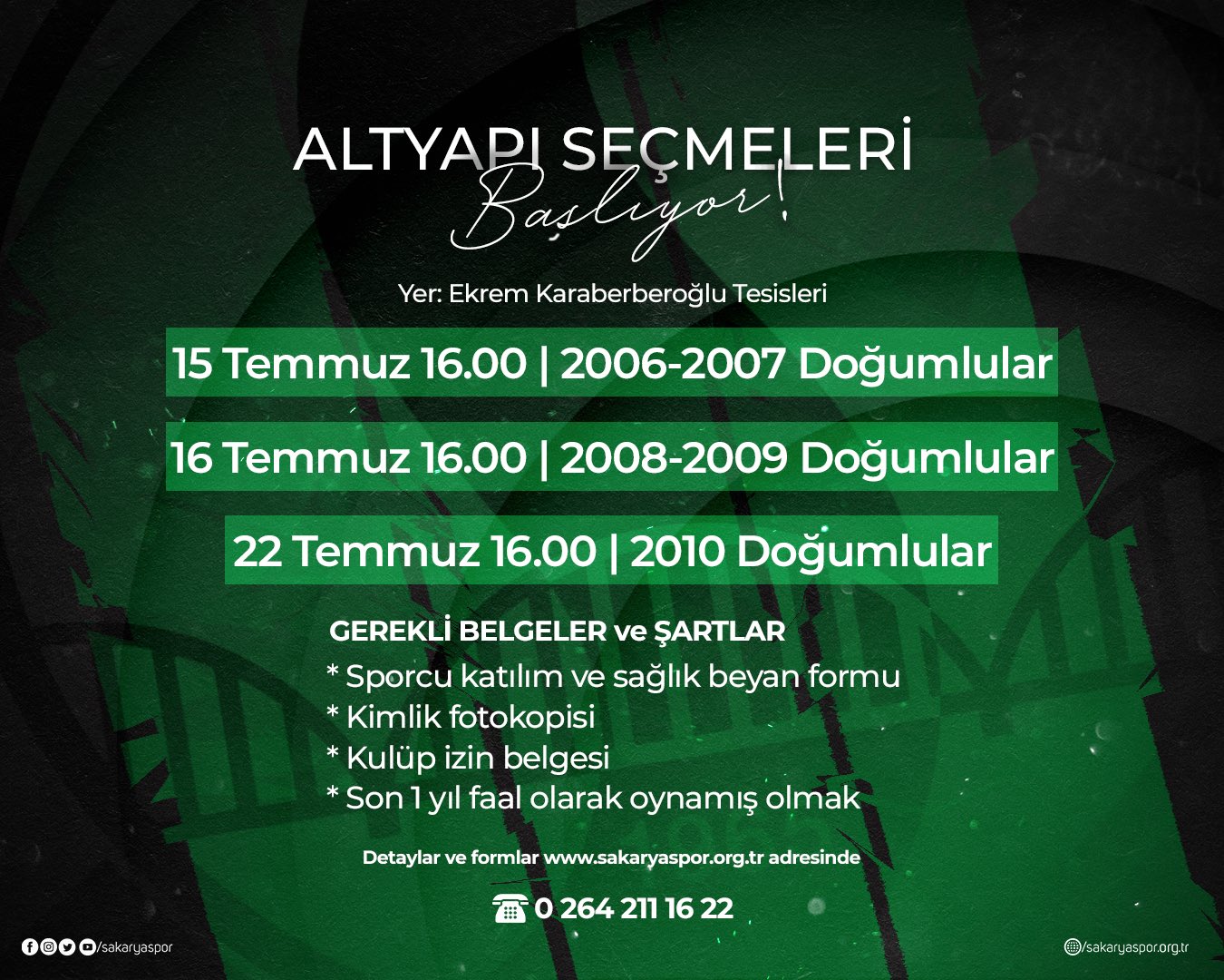 Yeşil Siyahlı Kulüpten yapılan açıklamada, " Belirtilen tarihlerde yapılacak olan seçmeler Ekrem Karaberberoğlu Tesislerimizde gerçekleştirilecektir. Katılım sağlayacak sporcular en geç 12 Temmuz tarihine kadar formları doğru şekilde doldurmaları Ekrem karaberberoğlu tesislerine teslim etmeleri gerekmektedir.