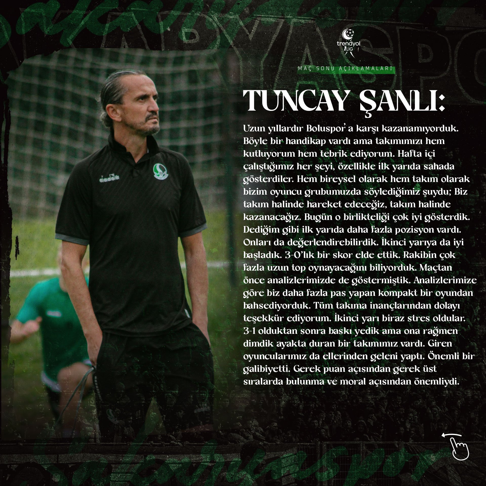 Trendyol 1. Lig'in 12. haftasında Sakaryaspor, Boluspor'a konuk oldu.Yeşil siyahlılar, deplasmanda 3-2 galip geldi, konuk ekibin golllerini 10'da Kasongo, 28'de Odise Roshi ve 53'te
