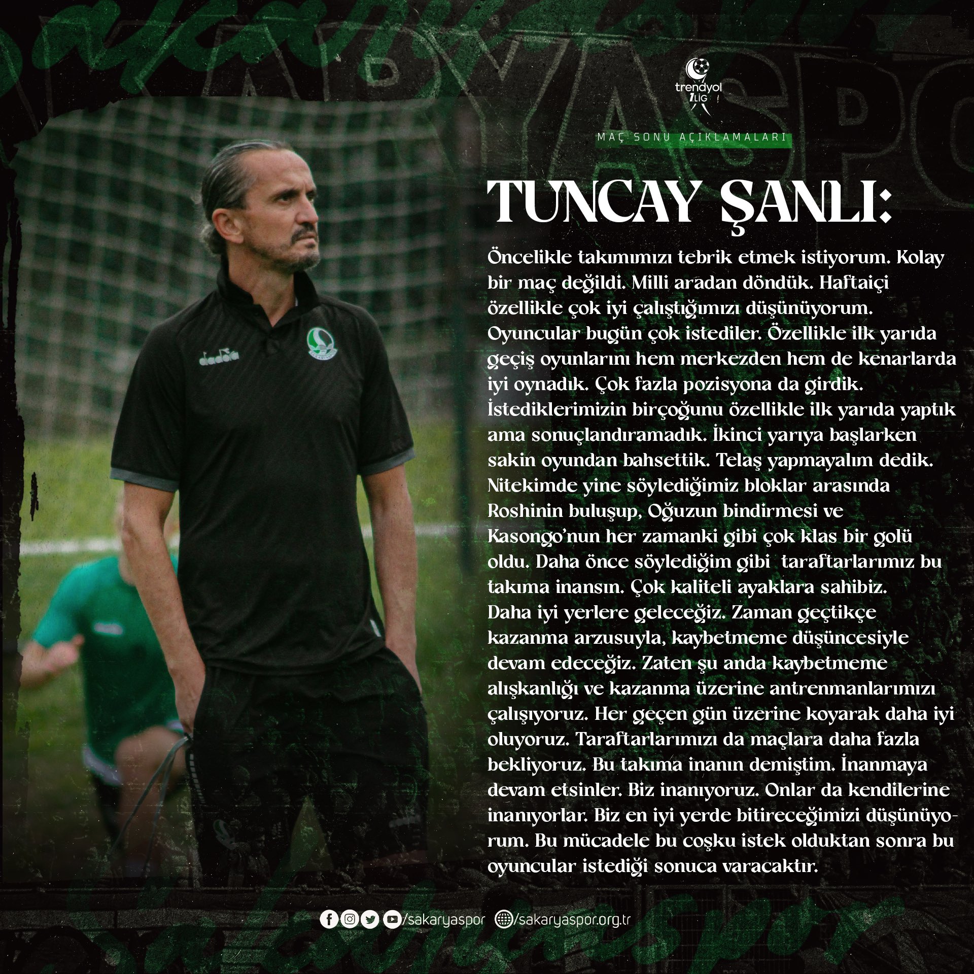 Trendyol 1. Lig'in 9. haftasında Sakaryaspor, konuk ettiği Adanaspor'u ikinci yarıda bulduğu gollerle 2-0 yendi.Sakaryaspor'a 3 puanı getiren golleri 60. dakikada Kabongo Kasongo ve 90. dakikada Murat Cem Akpınar kaydetti.Bu karşılaşmanın ardından Sakaryaspor puanını 12'ye çıkarttı. Adanaspor ise 9 puanda kalarak haftayı puansız kapattı. Karşılaşma sonra açıklamalarda bulunan Sakaryaspor Teknik Direktörü Tuncay Şanlı kolay bir maç olmadığını söyledi. Teknik direktör Şanlı, açıklamalarında şu ifadelere yer verdi :