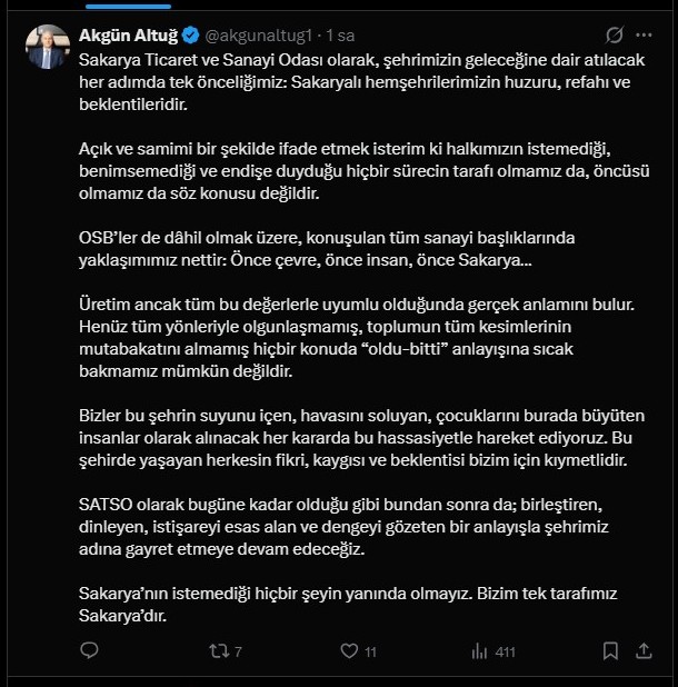 Sakarya Ticaret ve Sanayi Odası (SATSO) Yönetim Kurulu Başkanı Akgün Altuğ, sosyal medya hesabı üzerinden yaptığı açıklamayla, şehirde gündeme gelen sanayi ve OSB konularına ilişkin kamuoyuna önemli mesajlar verdi.Altuğ, SATSO’nun her adımında Sakarya halkının huzurunu, refahını ve beklentilerini öncelediğini vurgulayarak, “Halkımızın istemediği, benimsemediği ve endişe duyduğu hiçbir sürecin tarafı olmamız da, öncüsü olmamız da söz konusu değildir” ifadelerini kullandı.Sanayi yatırımları konusunda net bir duruş sergilediklerinin altını çizen Altuğ, “OSB’ler de dâhil olmak üzere konuşulan tüm sanayi başlıklarında yaklaşımımız nettir: Önce çevre, önce insan, önce Sakarya… Üretim ancak tüm bu değerlerle uyumlu olduğunda gerçek anlamını bulur” dedi.Henüz olgunlaşmamış ve toplumun tüm kesimlerinin mutabakatını almamış hiçbir konuda ‘oldu-bitti’ anlayışına sıcak bakmadıklarını belirten Altuğ, şehirde yaşayan herkesin görüş ve kaygılarının kendileri için kıymetli olduğunu ifade etti.Açıklamasında şehre karşı taşıdıkları sorumluluğa dikkat çeken Başkan Altuğ, “Bu şehrin suyunu içen, havasını soluyan, çocuklarını burada büyüten insanlar olarak alınacak her kararda bu hassasiyetle hareket ediyoruz” ifadelerine yer verdi.SATSO’nun bugüne kadar olduğu gibi bundan sonra da istişareyi esas alan, birleştirici ve denge gözeten bir anlayışla çalışmaya devam edeceğini belirten Altuğ, “Sakarya’nın istemediği hiçbir şeyin yanında olmayız. Bizim tek tarafımız Sakarya’dır” diyerek açıklamasını tamamladı.