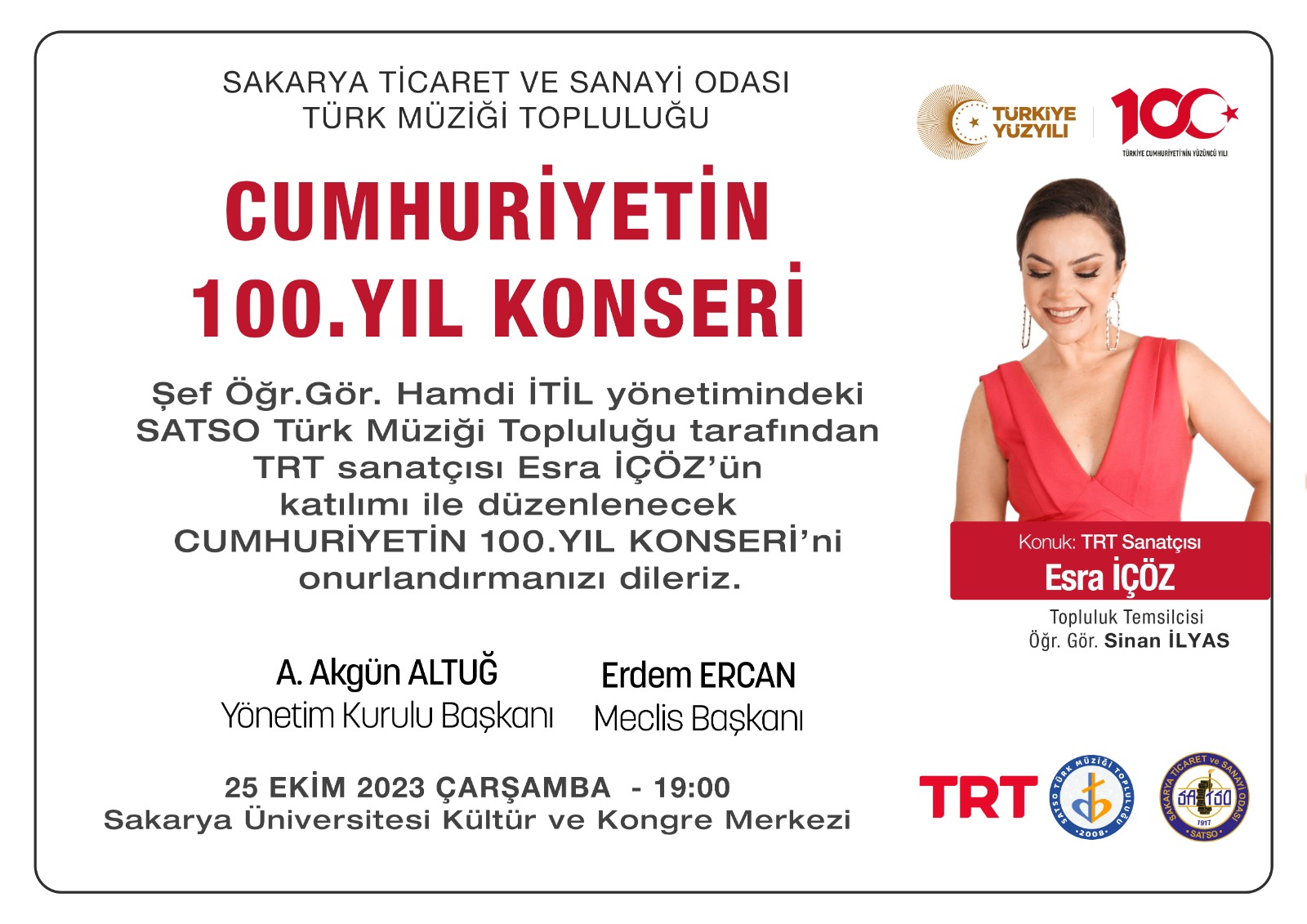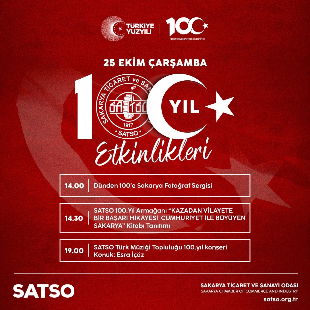 “DÜNDEN 100’E SAKARYA” SERGİSİİlk olarak 25 Ekim Çarşamba günü saat 14.00’te SATSO hizmet binasında saat 14.00’te SAGÜSAD’ın katkılarıyla Sakarya’nın daha önce sergilenmemiş tarihi şehir fotoğrafları ve günümüz karşılaştırmalı belgesel fotoğraf çekimleri ile sergilenecek SATSO hizmet binası fuaye alanında “Cumhuriyet’in 100. Yıl Sergisi” gerçekleştirilecek.“CUMHURİYET İLE BÜYÜYEN SAKARYA” KİTAP LANSMANIDünden 100’e Sakarya fotoğraf sergisinin açılış töreninin ardından aynı salonda Tarihçi Resül Narin tarafından derlenen bilgilerden oluşan SATSO’nun 100. Yıl armağanı olarak yayınlanan “Cumhuriyet ile Büyüyen Sakarya - Kazadan Vilayete Bir Başarı Hikayesi” isimli SATSO Prestij yayınının Tanıtım Töreni gerçekleştirilecek.SATSO TMT VE TRT SANATÇISI ESRA İÇÖZ 100. YIL KONSERİAynı akşam saat 19.00’da ise Sakarya Üniversitesi Kültür ve Kongre Merkezi’nde SATSO Türk Müziği Topluluğu tarafından, TRT Sanatçısı Esra İçöz’ün de katılımıyla Şef Öğr. Gör. Hamdi İtil yönetiminde “Cumhuriyet’in 100. Yıl Konseri” gerçekleştirilecek.TÜM SAKARYALILAR DAVETLİDİRSATSO Yönetim Kurulu Başkanı A. Akgün Altuğ, “Sayısız mücadele ile kazanılmış, Ulu Önderimiz Gazi Mustafa Kemal Atatürk öncülüğünde Türk Milleti’nin sağlam kudret ve inancı ile inşa ettiği Cumhuriyeti’miz 100 yaşına giriyor.99 yıldır her yıl 29 Ekim’de aynı gurur ile kutladığımız bu önemli gün, bu yıl daha anlamlı olacak. Bizler de SATSO olarak bu destansı kuruluş hikayesine yakışır bir şekilde etkinlikler tertip ettik.25 Ekim Çarşamba günü saat 14.00’te Odamız fuaye alanında “Dünden 100’e Sakarya” konulu fotoğraf sergimizin açılışını gerçekleştireceğiz. Fotoğraflarla geçmişi yâd edecek ve gelişimimize tanıklık edeceğiz. Saat 14.30’da Cumhuriyetin kurulduğu 1923’ten Sakarya’mızın il olduğu 1954 yılına kadar ilimizin gelişimini konu alan “Cumhuriyet ile Büyüyen Sakarya- Kazadan Vilayete Bir Başarı Hikayesi” isimli dönem kitabımızın lansman törenini gerçekleştireceğiz.Aynı akşam saat 19.00’da ise 15 yılı aşkın süredir Odamız bünyesinde faaliyetlerini yürüten SATSO Türk Müziği Topluluğu’muzun “100. Yıl Konseri”ni gerçekleştireceğiz. Şef Öğr. Gör. Hamdi İtil yönetimindeki konsere TRT Sanatçısı Esra İçöz de 100. yıla özel şarkılarla eşlik edecek.Milli duruşumuzun simgesi Cumhuriyetimizin 100. yılında da birlik ve beraberliğimizi koruyarak bu özel etkinliklerimize tüm Sakaryalılarımızı bekliyoruz.”