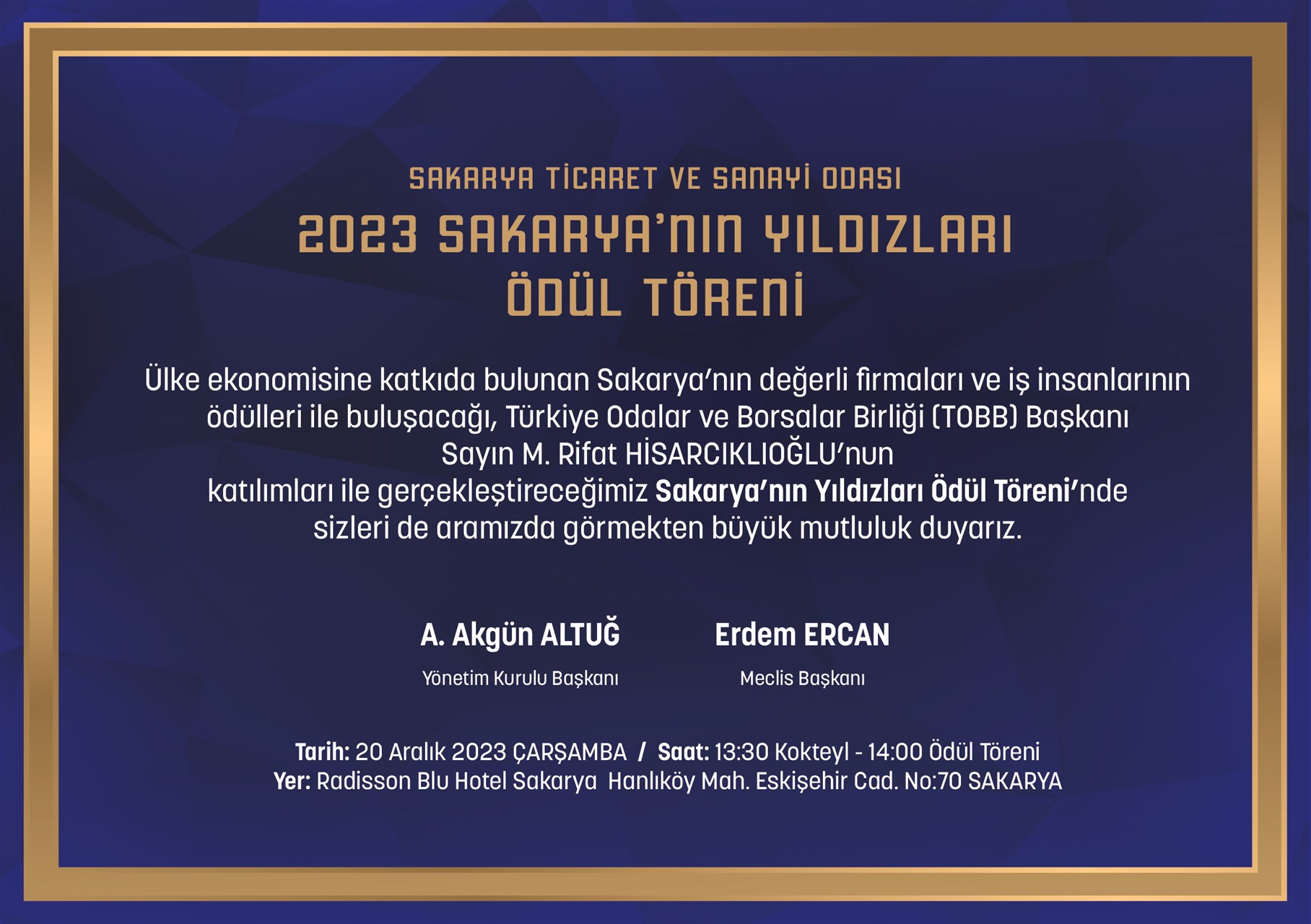 Sakarya'nın Yıldızları Ödül Töreni ile ilgili değerlendirmede bulunan Sakarya Ticaret ve Sanayi Odası Yönetim Kurulu Başkanı A. Akgün Altuğ şunları dile getirdi; “Cumhuriyetimizin 100. Yılını Odamızın 106. Yılını geride bırakmaya hazırlandığımız bu özel yılı kapatmadan geleneksel olarak yaptığımız Sakarya’nın Yıldızları Ödül törenini gerçekleştirecek olmaktan dolayı heyecanlıyız.Bir asrı geçen köklü tarihi ve şehrin önder kurumları arasında yer almanın sorumluluğu ile üyelerimizin ve şehrimizin menfaatleri doğrultusunda hizmetlerimizi devam ettirirken şehrimize hizmet edip gururumuz olanları hep birlikte alkışlayacağız. Sakarya’mıza değer katan iş insanları ve markalarımıza çeşitli kategorilerde ödül vereceğiz. Törenimizde kıymetli üyelerimiz ve tüm Sakaryalı hemşehrilerimizle bir arada olmaktan memnuniyet duyacağız.”