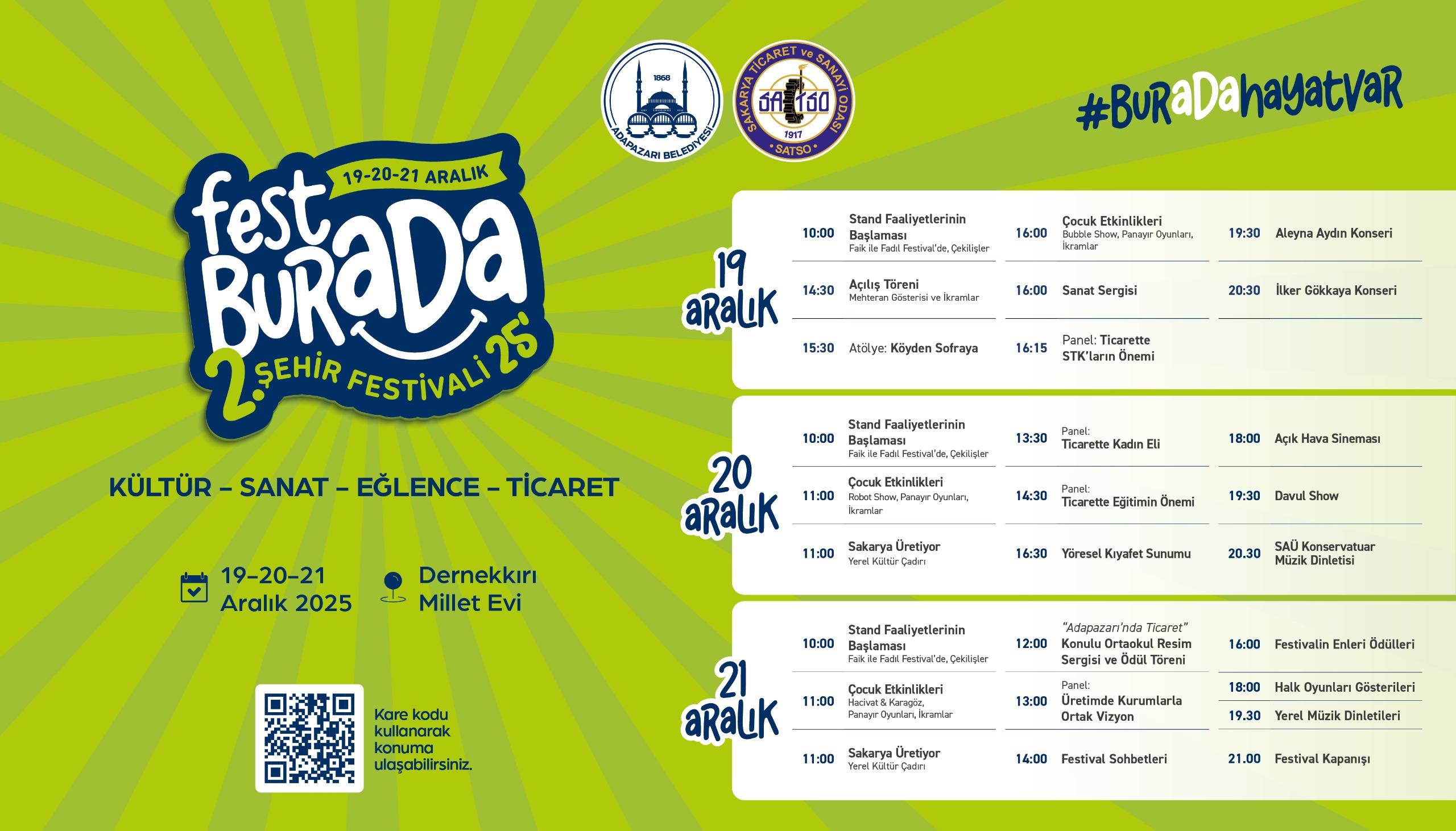 Adapazarı Belediye Başkanı Mutlu Işıksu, yaptığı açıklamada, FestBurada’nın şehrin sosyal, kültürel ve ticari dinamizmini bir araya getiren önemli bir buluşma noktası olduğunu dile getirerek, tüm şehir insanını festivale davet etti.Kültür, sanat, eğlence ve ticareti bir araya getiren festival, üç gün boyunca söyleşilerden panellere, atölye çalışmalarından çocuk etkinliklerine, sahne gösterilerinden konserlere uzanan zengin bir program akışıyla gerçekleştirilecek.Festival 19 Aralık Cuma Günü BaşlıyorFestivalin ilk günü olan 19 Aralık Cuma, saat 10.00’da stant faaliyetlerinin başlamasıyla kapılarını açacak. Gün boyunca çekilişler ve çeşitli etkinlikler düzenlenecek. Saat 14.30’da Mehteran Gösterisi eşliğinde gerçekleştirilecek açılış töreninin ardından; atölye çalışmaları, çocuk etkinlikleri ve sanat sergileri ziyaretçilerle buluşacak.Aleyna Aydın ve İlker Gökkaya KonseriGünün devamında “Ticarette STK’ların Önemi” başlıklı panel düzenlenecek; akşam saatlerinde Aleyna Aydın ve İlker Gökkaya konserleri, Festival coşkusunu zirveye taşıyacak.Cumartesi Programı Paneller ve Gösterilerle Dolu20 Aralık Cumartesi günü festival, yine saat 10.00’da stant faaliyetleriyle başlayacak. Çocuklara yönelik robot gösterileri ve panayır oyunları, gün boyunca festival alanına renk katacak. “Sakarya Üretiyor – Yerel Kültür Çadırı” ziyaretçilerini ağırlarken; “Ticarette Kadın Eli” ve “Ticarette Eğitimin Önemi” başlıklı paneller gerçekleştirilecek. Yöresel kıyafet sunumu, açık hava sineması, davul gösterisi ve SAÜ Konservatuvarı müzik dinletisi ile festivalin ikinci günü dopdolu geçecek.Festival, Ödüller ve Kapanış Programıyla TamamlanacakFestivalin son günü olan 21 Aralık Pazar, stant faaliyetleri, çocuk etkinlikleri ve yerel kültür çadırı ile başlayacak. Gün içinde “Adapazarı’nda Ticaret” konulu ortaokul resim sergisi ve ödül töreni düzenlenecek. “Üretimde Kurumlarla Ortak Vizyon” paneli ve festival sohbetlerinin ardından Festivalin Enleri Ödülleri sahiplerini bulacak. Halk oyunları gösterileri ve yerel müzik dinletileriyle sürecek etkinlikler, saat 21.00’de gerçekleştirilecek kapanış programıyla sona erecek.