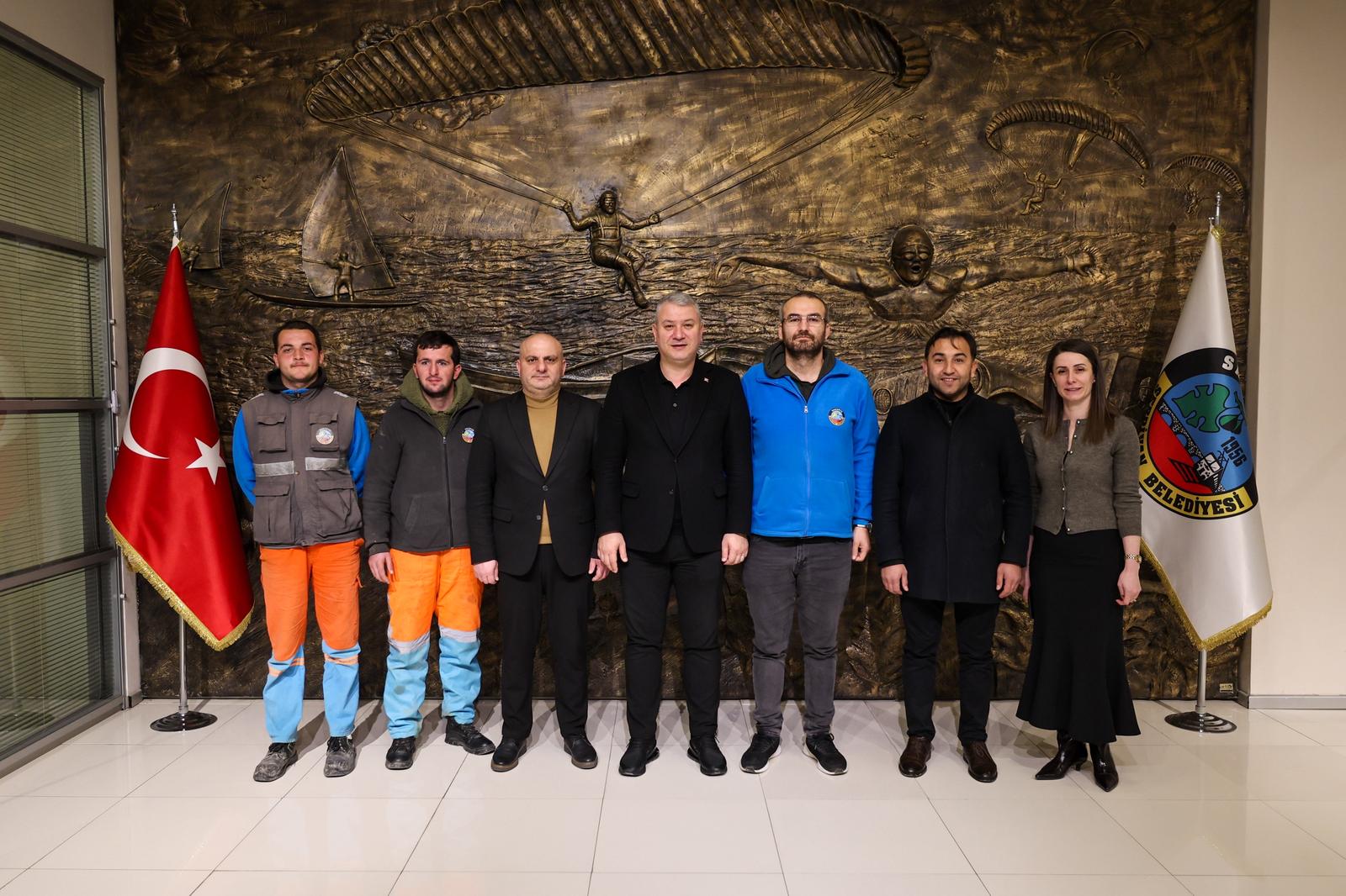 Başkan Osman Çelik’ten Personeline Anlamlı TeşekkürBelediye çalışanlarının sergilediği bu örnek tutuma kayıtsız kalmayan Serdivan Belediye Başkanı Osman Çelik, Harun Ok, Salih Efe Korkusuz ve Onur Akdeniz’i makamında ağırladı. Personelini duyarlılıklarından dolayı tek tek tebrik eden Başkan Çelik, Serdivan halkına hizmet götürürken gösterilen bu tür insani yaklaşımların kurum kültürü açısından çok değerli olduğunu vurguladı. Ziyaret sonunda özverili personellerine teşekkür plaketi takdim eden Başkan Çelik, "Çalışma arkadaşlarımız yalnızca Serdivan’a değil, gönüllere de dokunuyor. Vicdanlı ve duyarlı insanlar çoğaldıkça, dünya daha da güzelleşiyor. Mesai arkadaşlarımızın dikkati ve yardımseverliği bizleri gururlandırdı" ifadelerini kullandı.