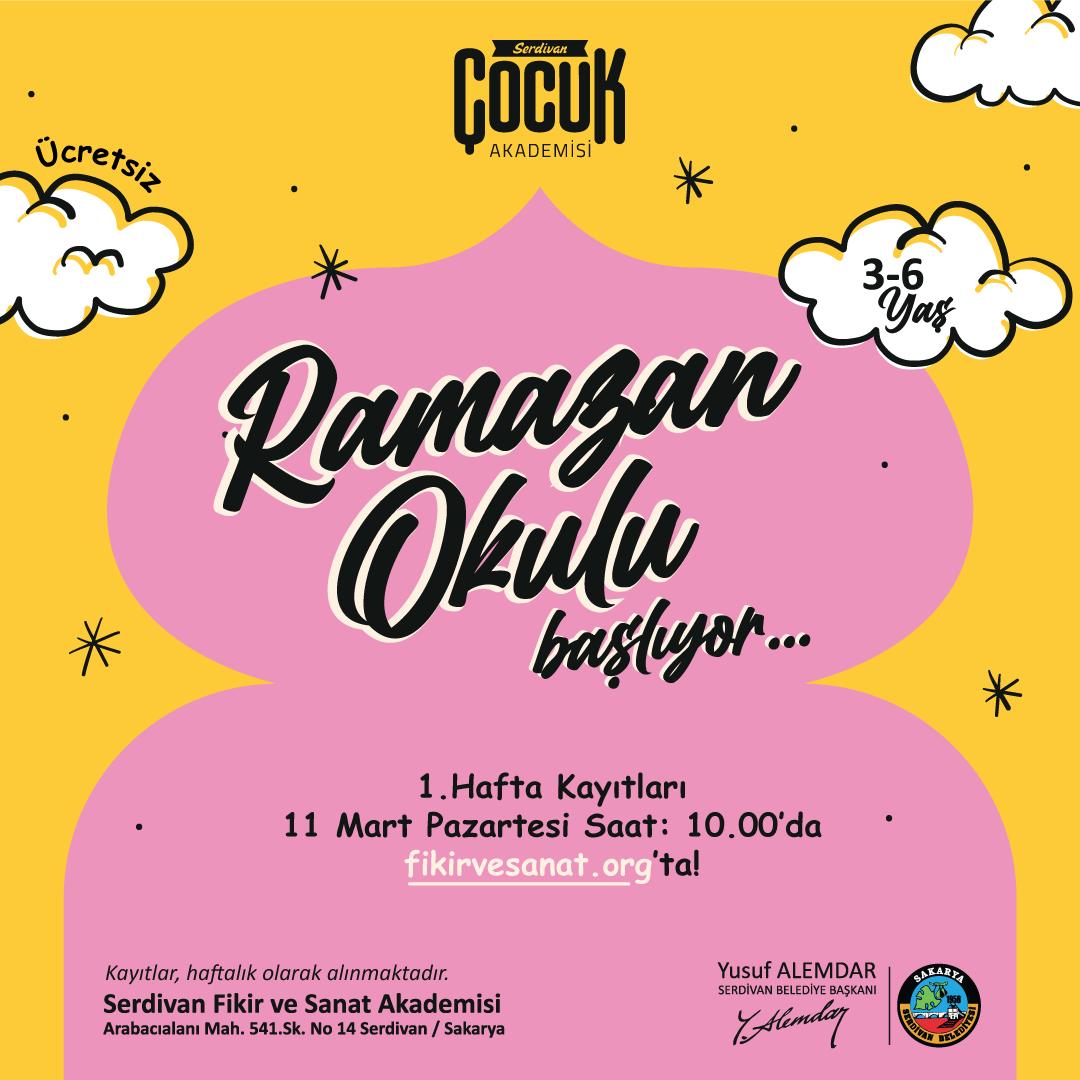 Son yılı aşkın tecrübesi ile artık geleneksel hale gelen Serdivan Ramazan Okulu'na yoğun bir talep olduğu ve bu talebe yetişebilmek adına atölye kontenjanlarının arttırıldığı ifade edildi. Ramazan Okulu etkinlikleri kapsamında 16 Mart Çarşamba günü Karagöz ve Hacivat gölge oyunu 6-12 yaş çocuklarla buluşacak. Ücretsiz olarak gerçekleştirilecek olan geleneksel gölge oyununa kayıtlar fikirvesanat.org adresi üzerinden alınacak.