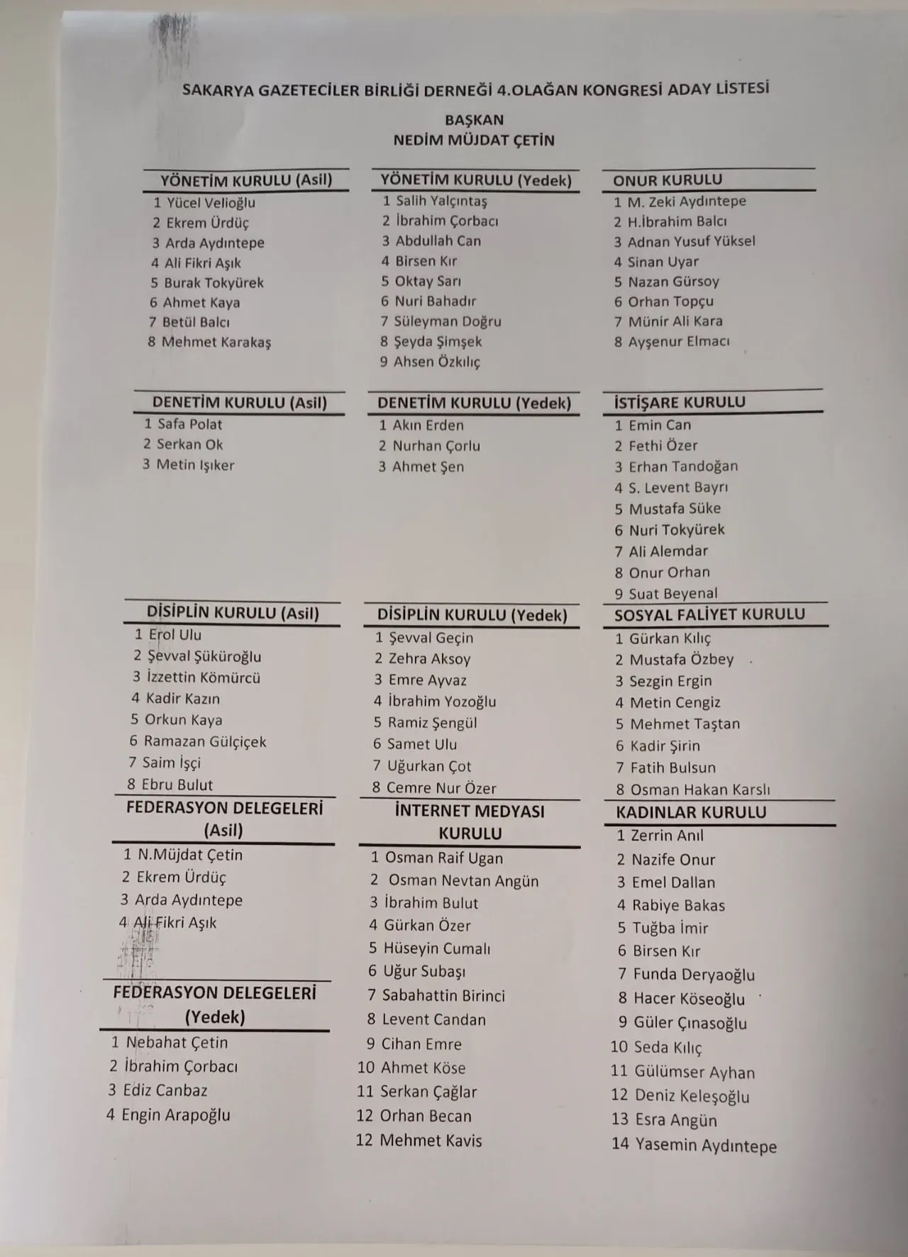 SAKARYA GAZETECİLER BİRLİĞİ DERNEĞİ 4.OLAĞAN KONGRESİ ADAY LİSTESİ
