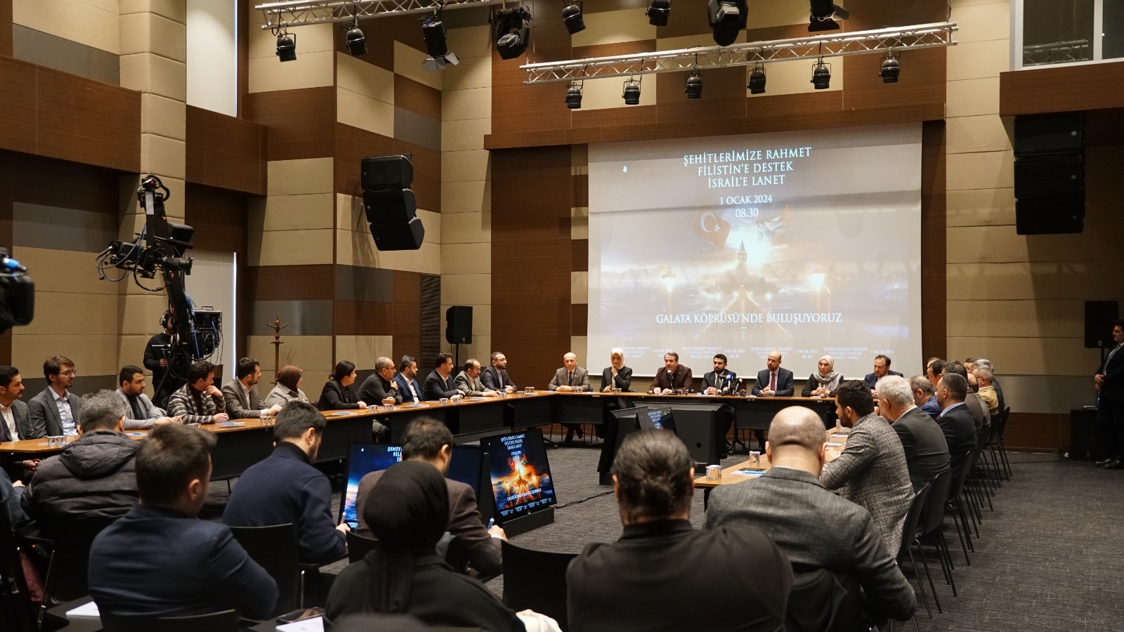 İstanbul’da Galata Köprüsü’nde düzenlenecek olan “Şehitlerimize Rahmet, Filistin’e Destek, İsrail’e Lanet Yürüyüşü” için 22 büyük sivil toplum kuruluşu bir araya geldi. STK’lar adına paylaşılan ortak bildiri TÜGVA Genel Başkanı İbrahim Beşinci tarafından okundu. Açıklama “teröre ve terör örgütlerine destek verenlere, şehitlerimizden aldığımız ilhamla, tüm dünyaya bu milletin mesajını vereceğiz” sözleriyle başlandı.