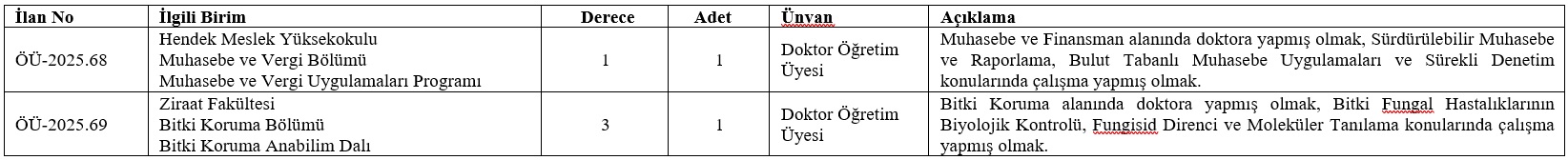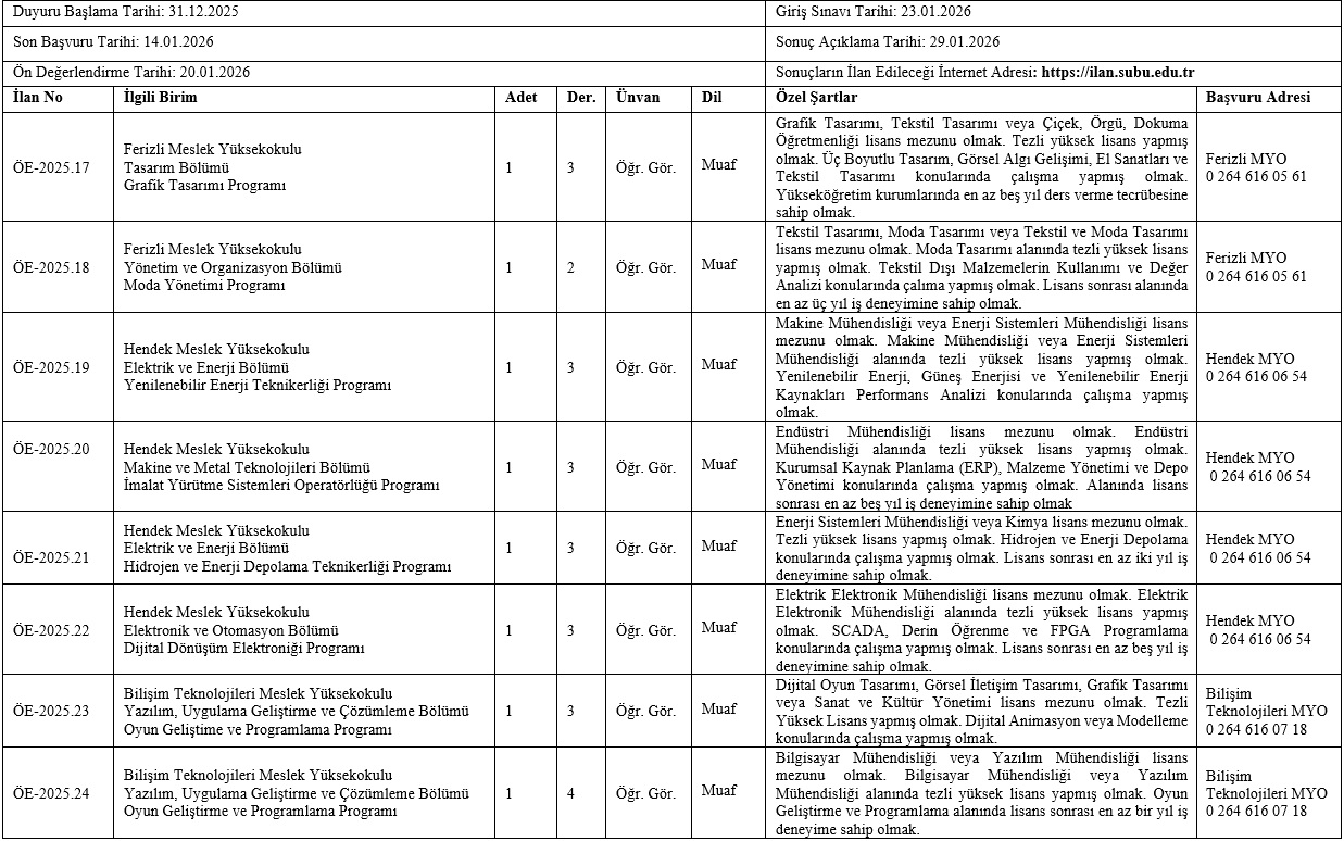 Sakarya Uygulamalı Bilimler Üniversitesi (SUBÜ); Rektörlük, Ziraat Fakültesi, Bilişim Teknolojileri Meslek Yüksekokulu, Ferizli Meslek Yüksekokulu, Hendek Meslek Yüksekokulu’nda görev yapmak üzere akademik personel alım ilanına çıktı.İlanla; 2 doktor öğretim ve 12 öğretim görevlisi alınacak. Kadrolar için ilanın Resmî Gazete’de yayımlandığı tarihten itibaren 15 gün içerisinde başvuru yapılabilecek. Başvuru süreci ve sonuçlar https://ilan.subu.edu.tr/ adresinden takip edilebilecek.